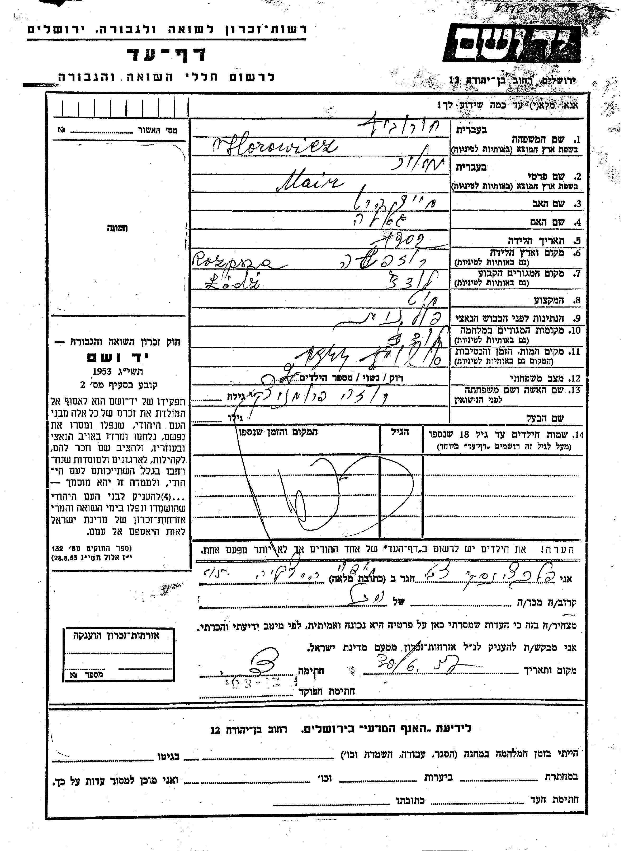 Mair Horowicz wurde im Jahr 1902 in Rozprza, Polen geboren. Er war der Sohn von Khaim Hersh und Gela. Er war Schneider und mit Roza, geb. Promnitzki Verheiratet. Vor dem Zweiten Weltkrieg lebte er in Lodz, Polen. Während des Krieges war er in Lodz, Polen.