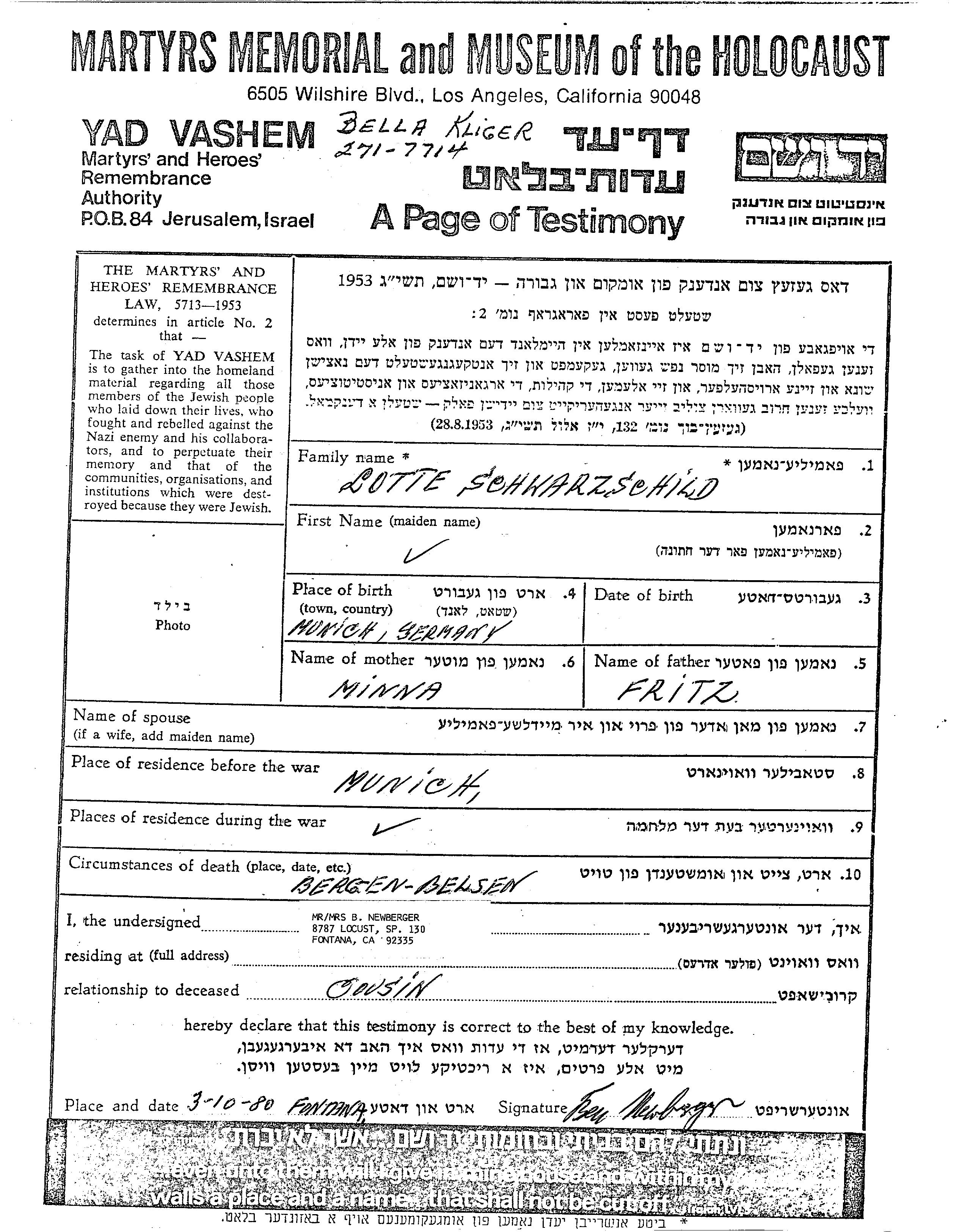 Schwarzschild Lotte unbekannter Ort, Gedenkblatt