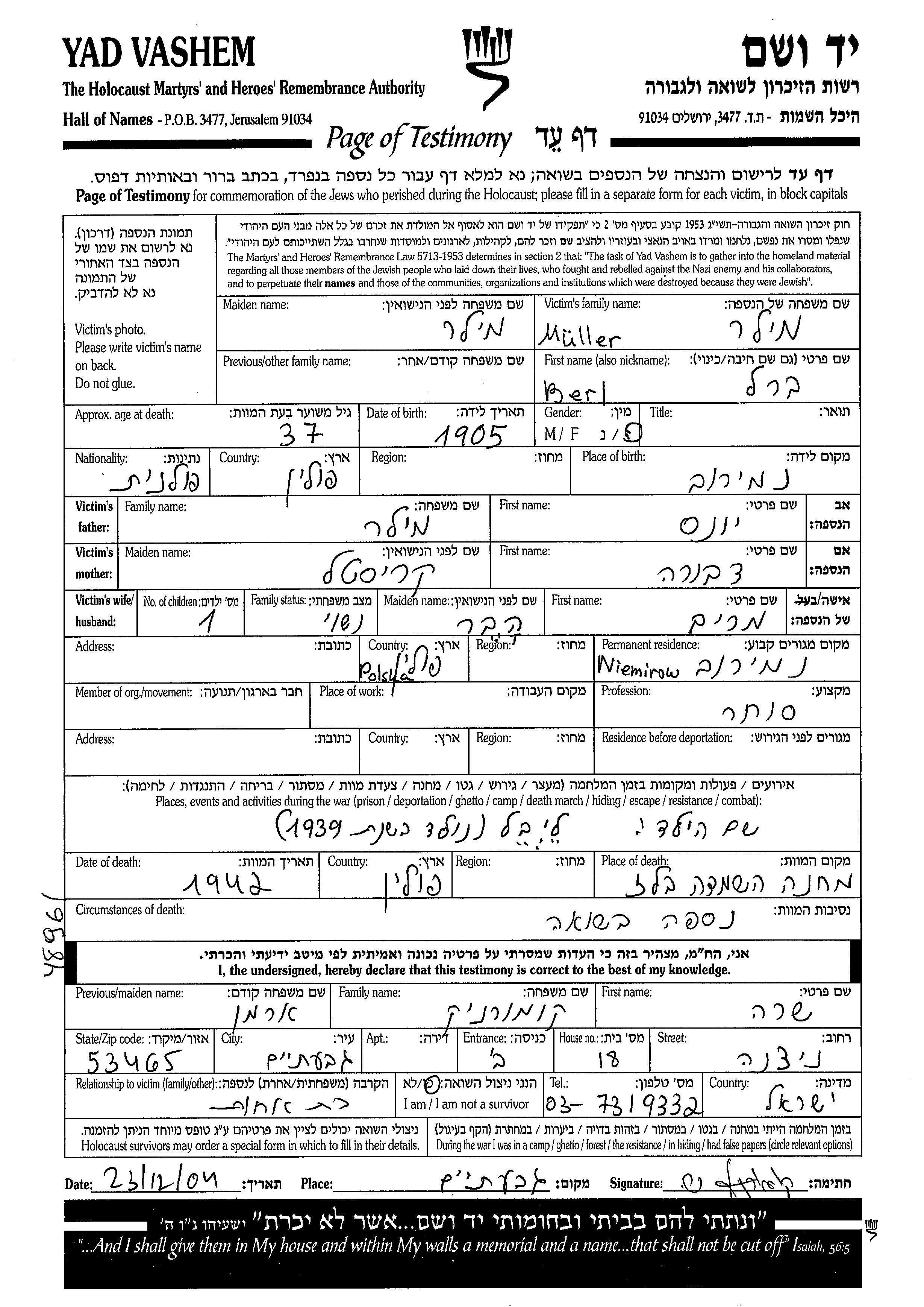 Berl Miler wurde im Jahr 1905 in Niemirow, Polen geboren. Er war der Sohn von Ionas und Dvora, geb. Kristal. Er war Kaufmann/-frau und mit Miriam, geb. Heber Verheiratet. Vor dem Zweiten Weltkrieg lebte er in Niemirow, Polen.
