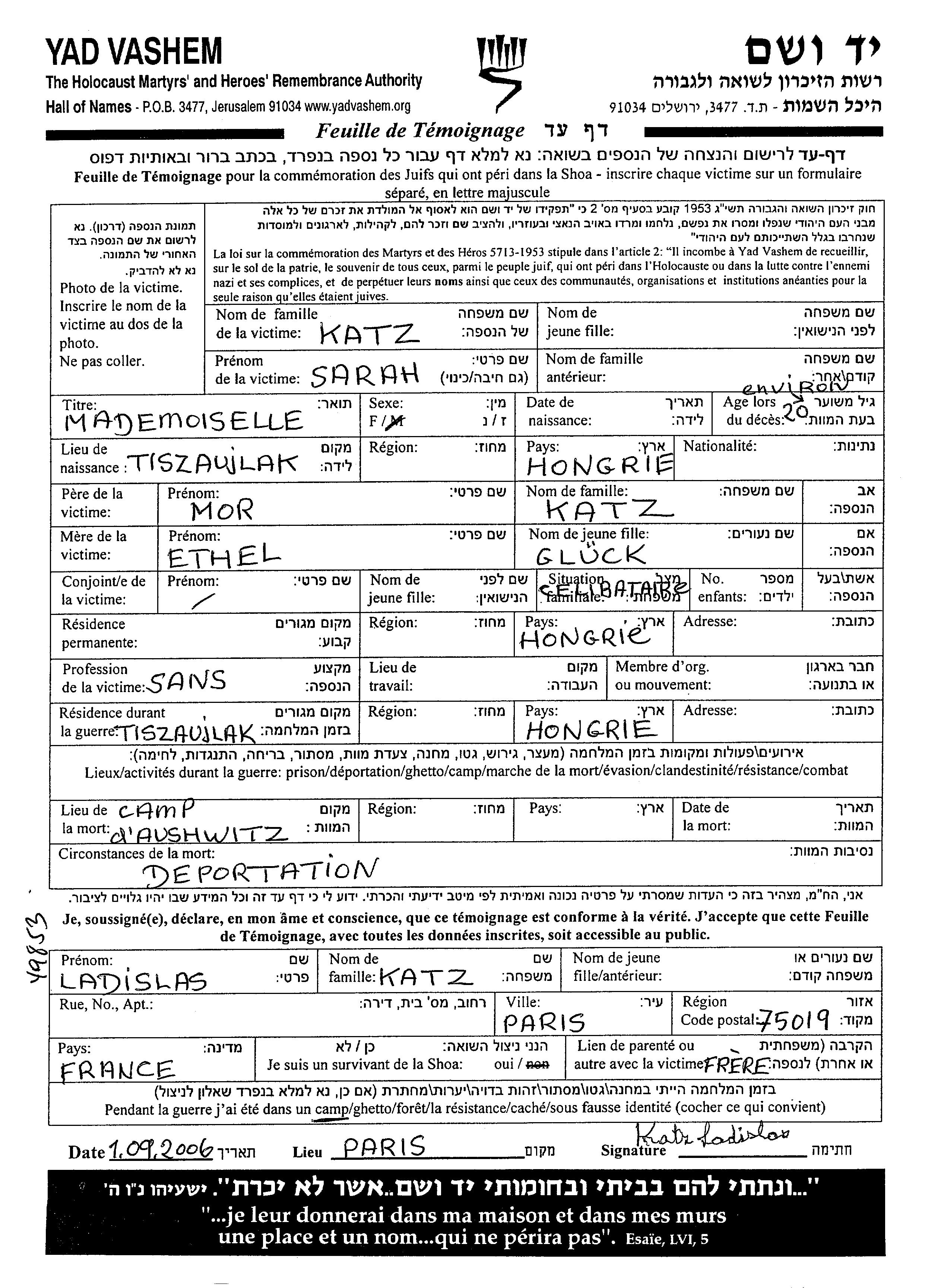 Sarah Katz wurde in Tiszaujlak, Tschechoslowakei geboren. Sie war die Tochter von Mor und Ethel, geb. Glück. Sie war Ohne beruf und Ledig. Vor dem Zweiten Weltkrieg lebte sie in Ungarn. Während des Krieges war sie in Tiszaujlak, Tschechoslowakei.
