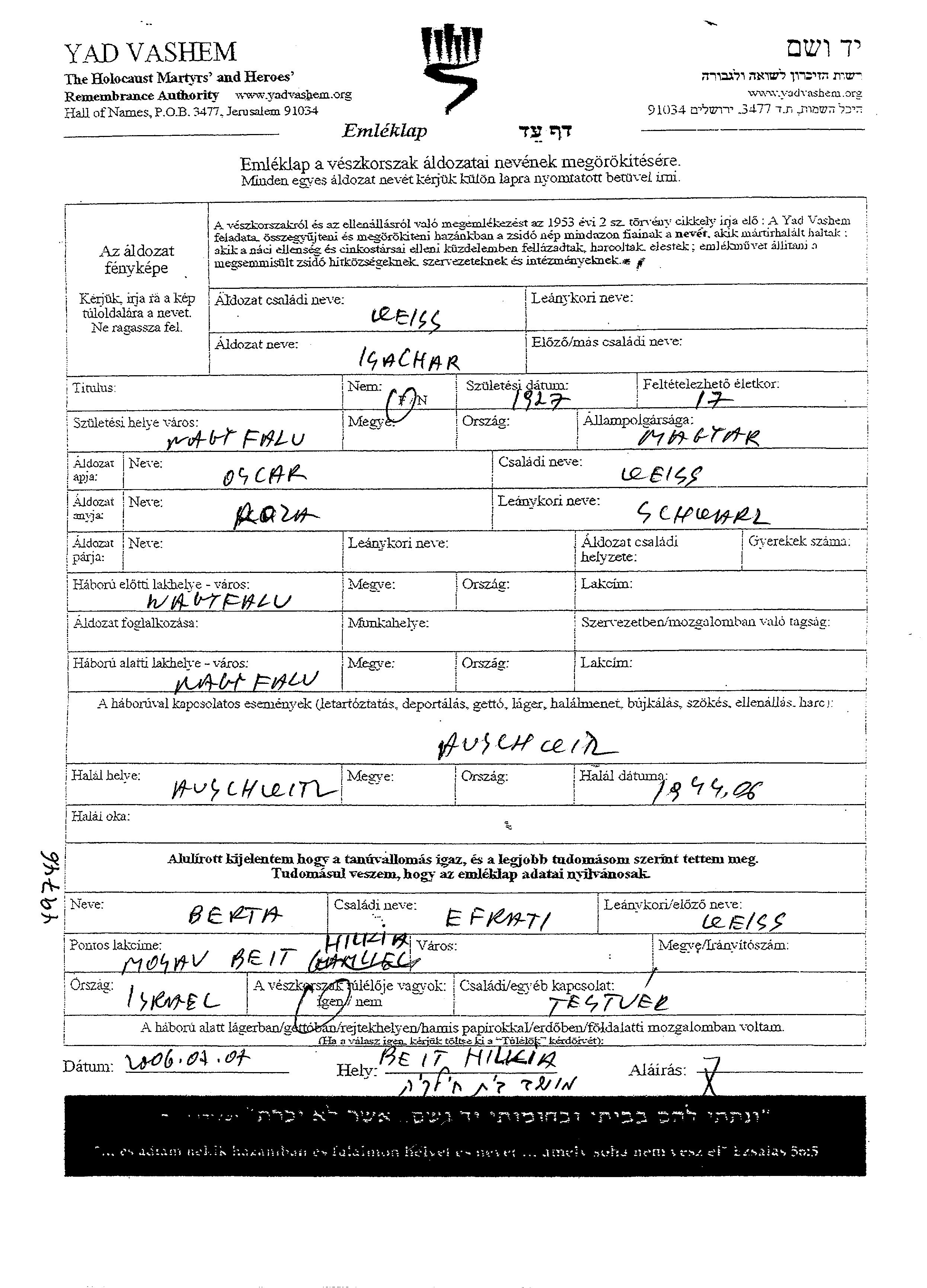 Isachar Weiss wurde im Jahr 1927 in Nagyfalu geboren. Er war der Sohn von Oscar und Roza, geb. Schwarz. Er war Jugendliche/-r. Vor dem Zweiten Weltkrieg lebte er in Nagyfalu. Während des Krieges war er in Nagyfalu.