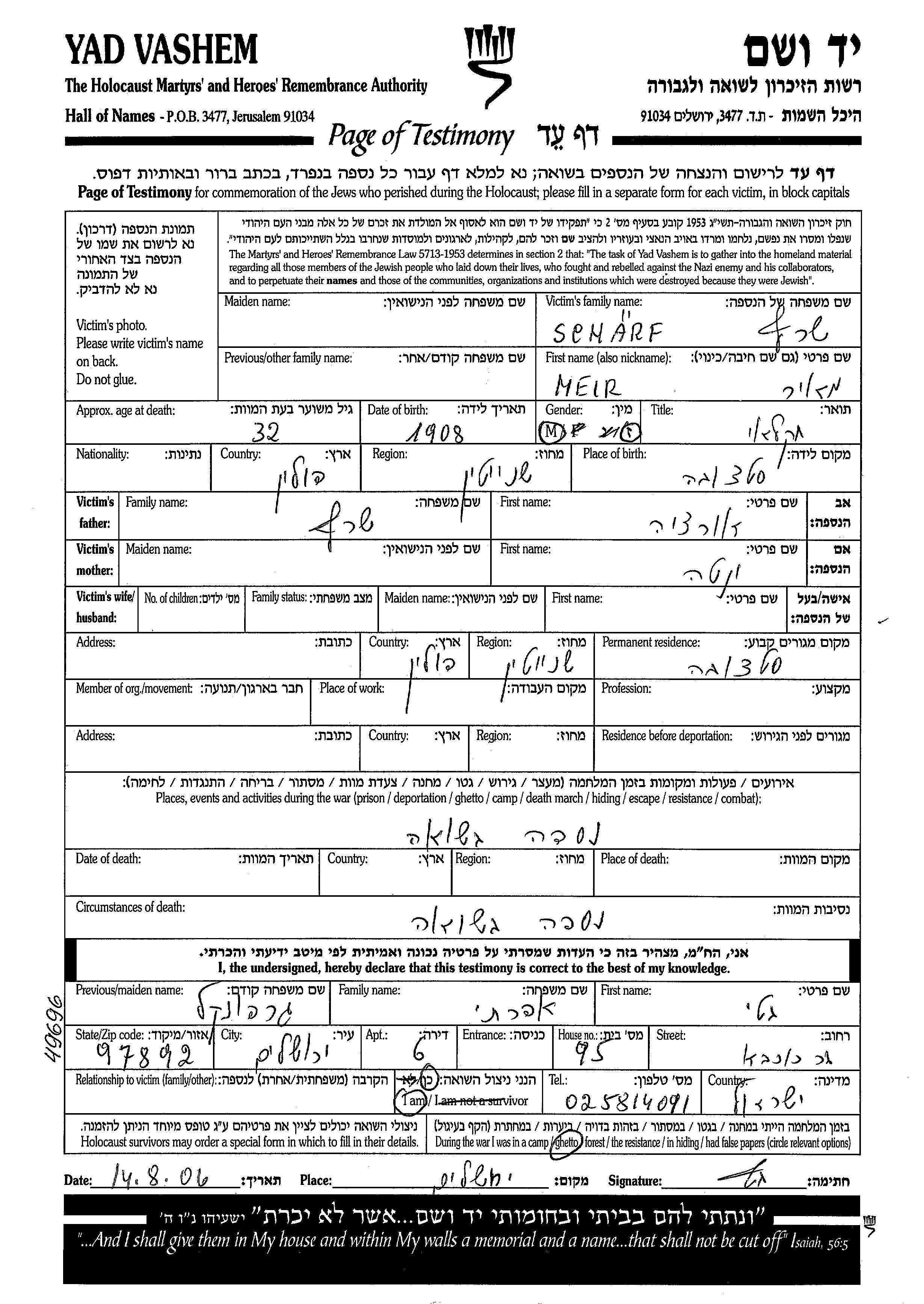Meir Scharf wurde im Jahr 1908 in Stecowa, Polen geboren. Er war der Sohn von Orcha und Yenta. Vor dem Zweiten Weltkrieg lebte er in Stecowa, Polen.