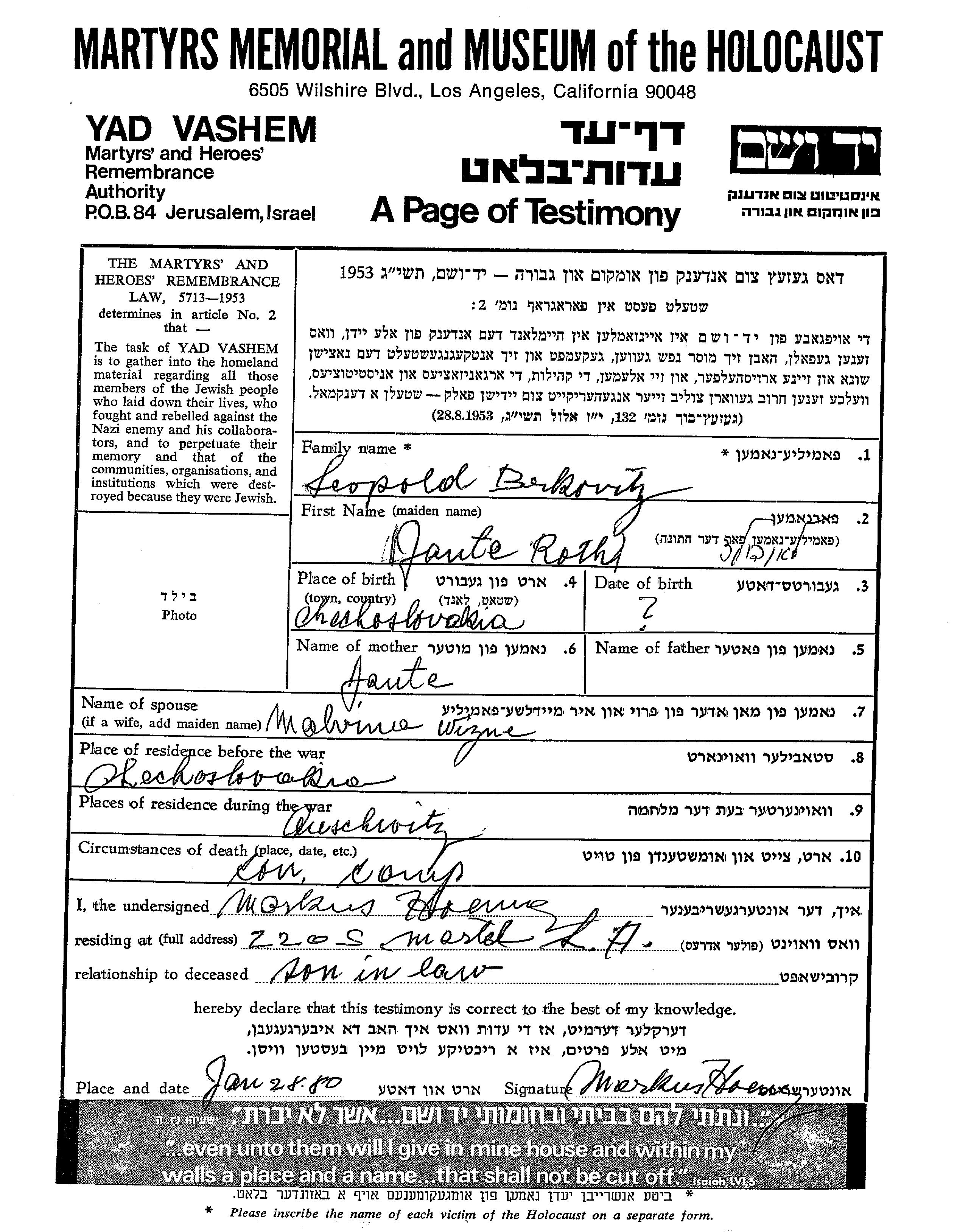 Leopold Berkovitz wurde in Tschechoslowakei geboren. Er war der Sohn von Jante Rochl. Er war mit Malvina, geb. Wizner Verheiratet. Vor dem Zweiten Weltkrieg lebte er in Tschechoslowakei. Während des Krieges war er in Auschwitz, Polen.