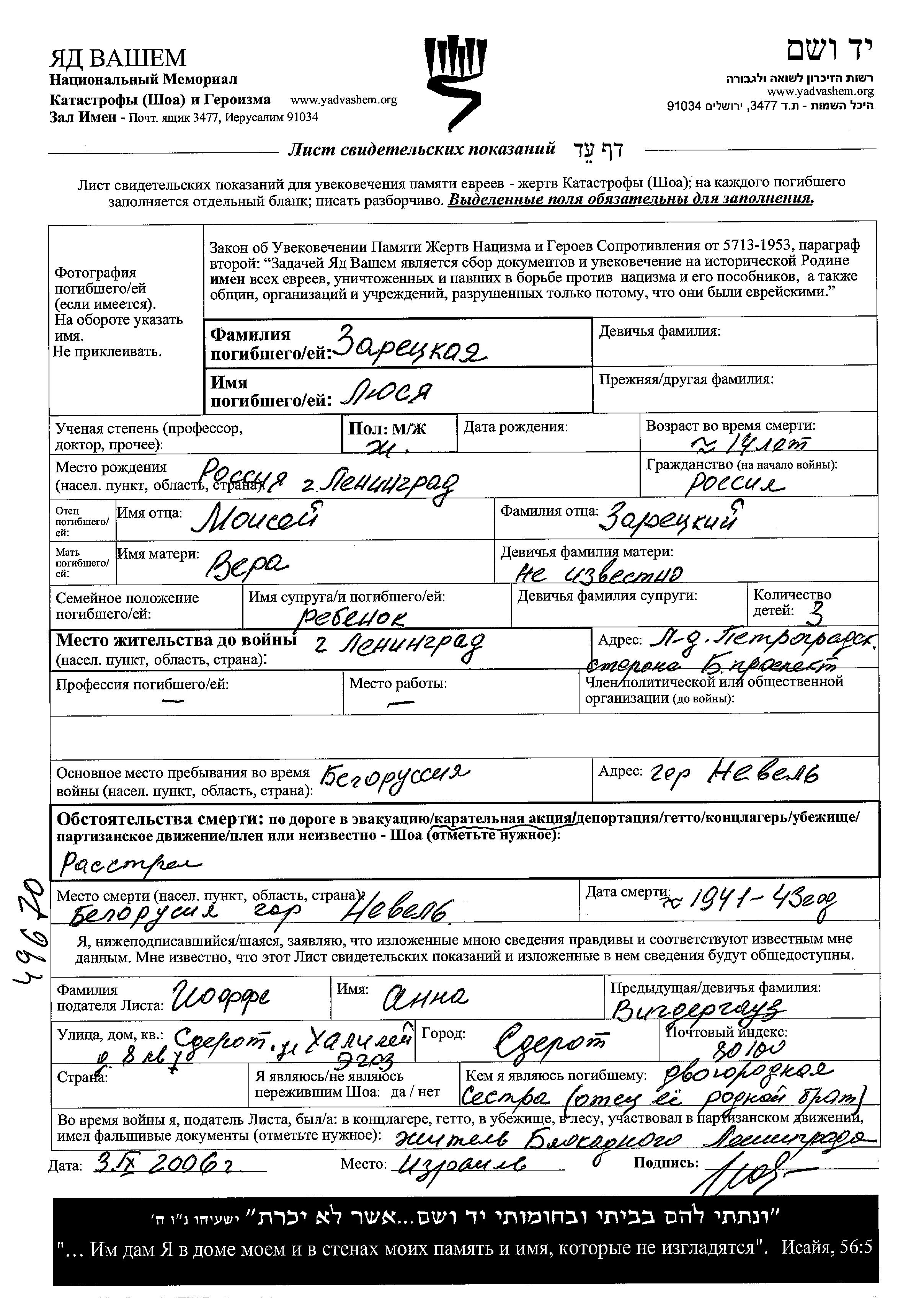 Lyusya Zaretzkaya wurde in Leningrad, Russland (UdSSR) geboren. Sie war die Tochter von Moisei und Vera. Sie war Schüler/-in und Jugendliche/-r. Vor dem Zweiten Weltkrieg lebte sie in Leningrad, Russland (UdSSR). Während des Krieges war sie in Nevel, Polen.