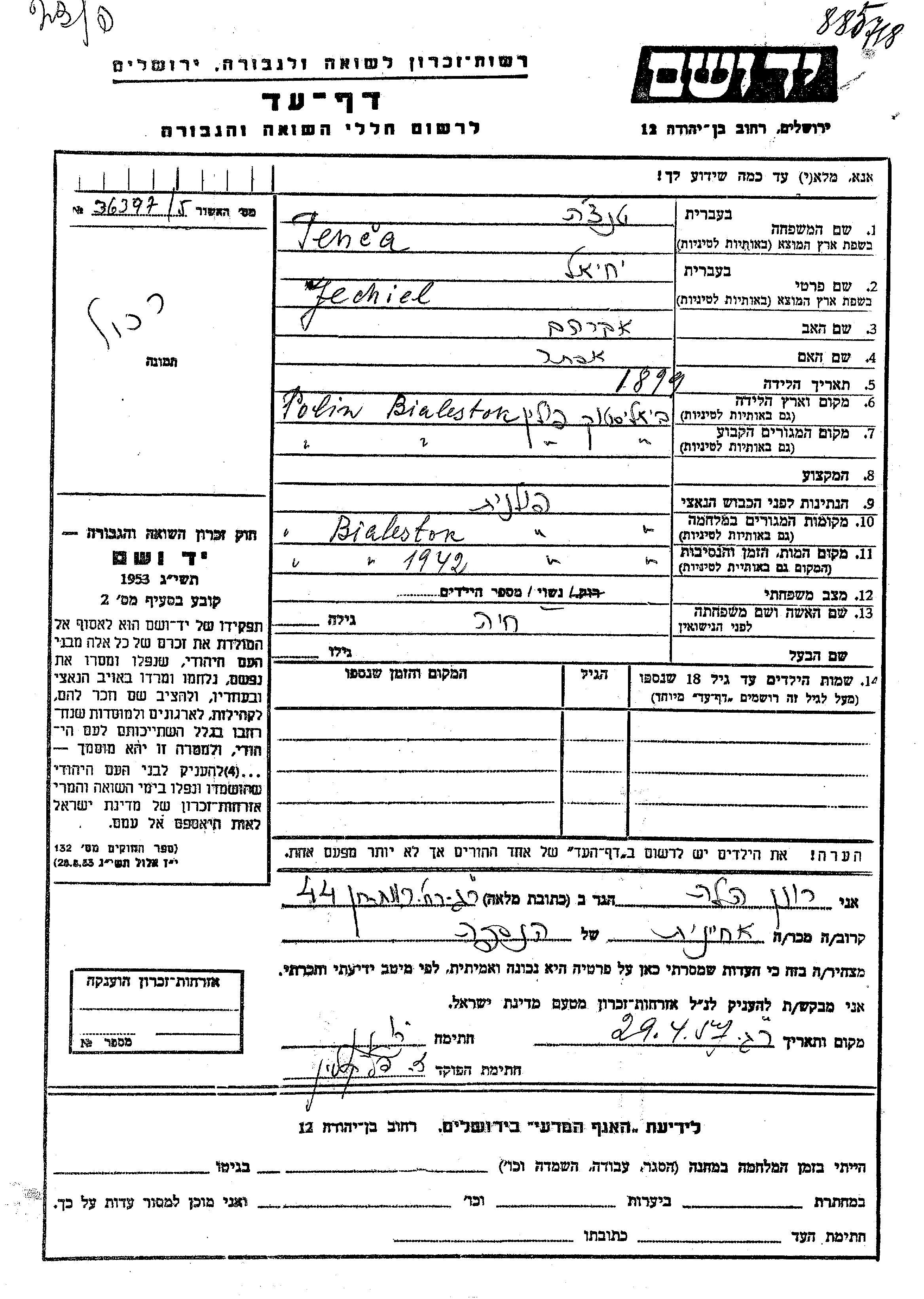 Jechiel wurde in der Schoah ermordet. Todesort: Bialystok, Polen im Jahr 1942.