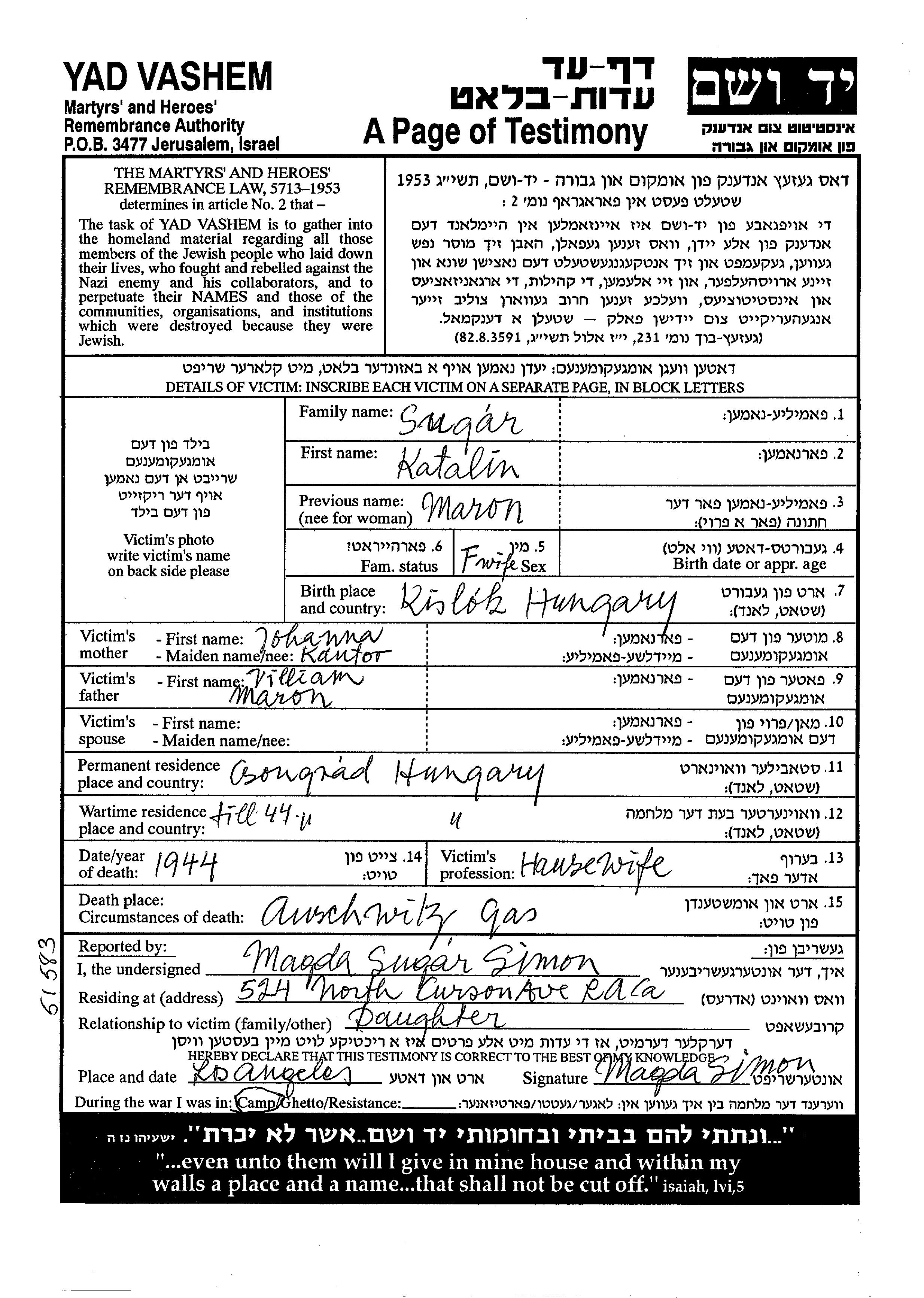 Katalin Sugar, geb. Maron wurde in Kislok, Ungarn geboren. Sie war die Tochter von Villiam und Johanna, geb. Kantor. Sie war Hausfrau. Vor dem Zweiten Weltkrieg lebte sie in Csongrad, Ungarn. Während des Krieges war sie in Csongrad, Ungarn.