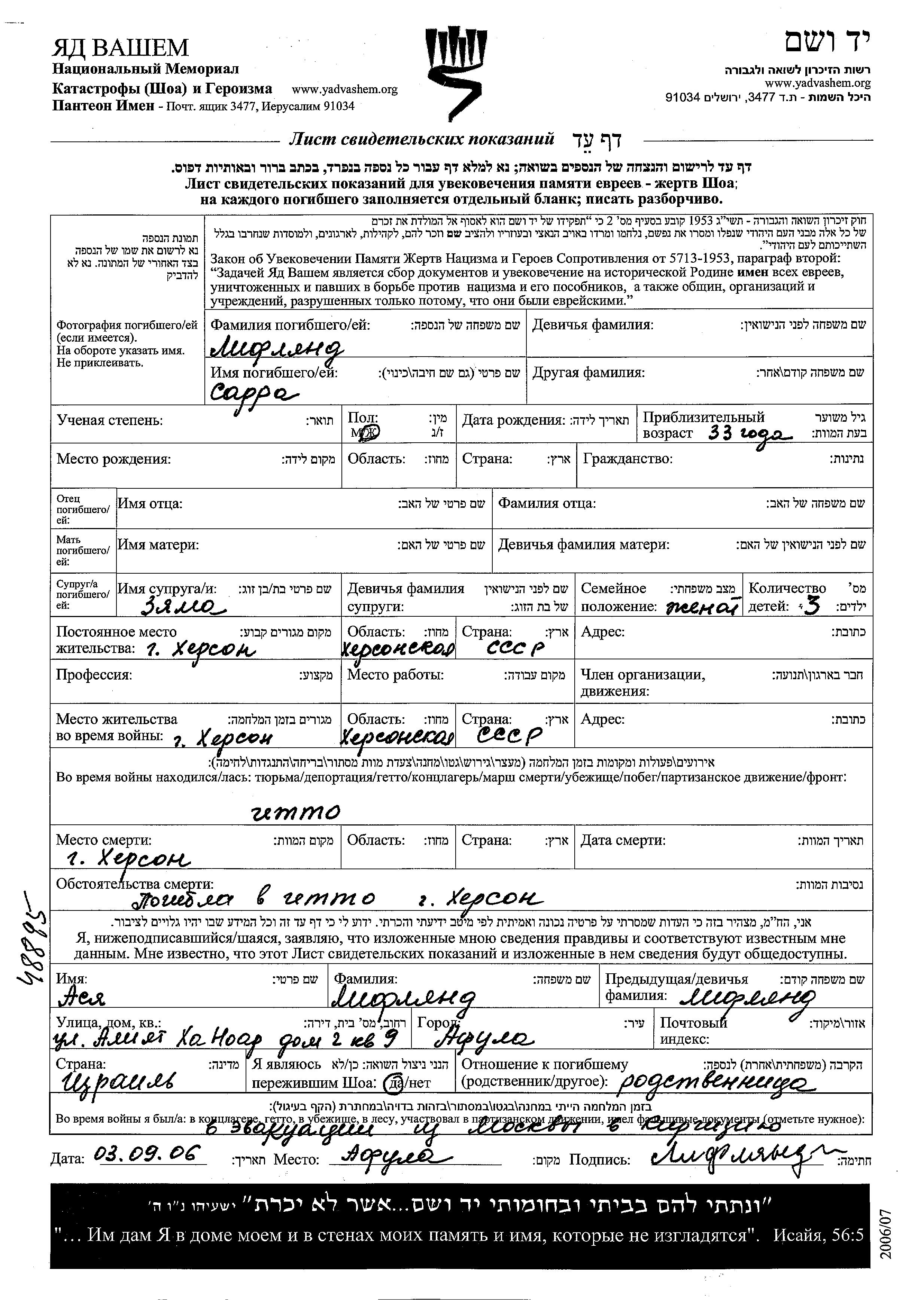 Sarra Liflyand. Sie war mit Zyama Verheiratet. Vor dem Zweiten Weltkrieg lebte sie in Kherson, Ukraine (UdSSR). Während des Krieges war sie in Kherson, Ukraine (UdSSR).