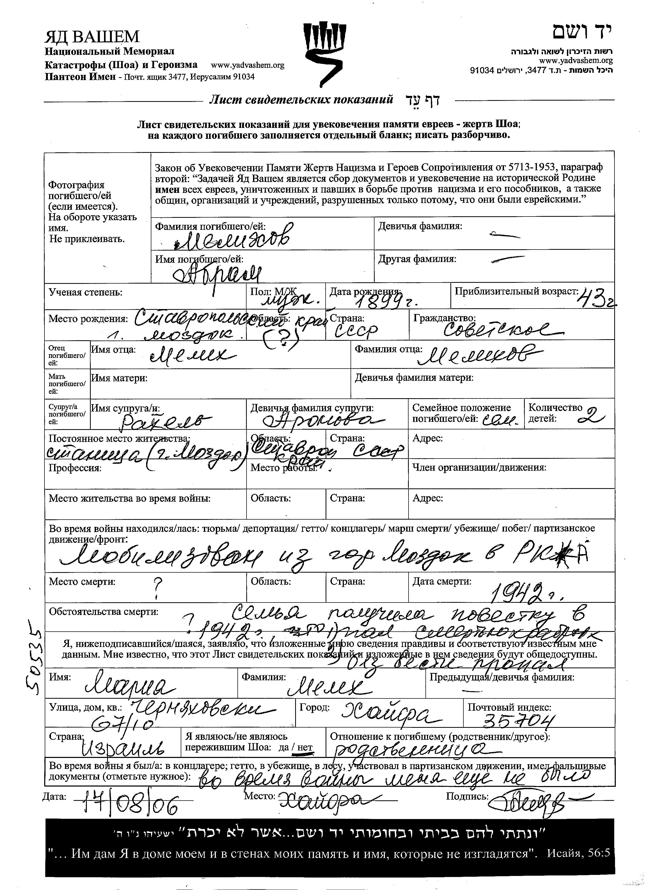 Abram Melikhov wurde im Jahr 1899 in Mozdok, Russland (UdSSR) geboren. Er war der Sohn von Melikh. Er war mit Rakhel, geb. Aronova Verheiratet. Vor dem Zweiten Weltkrieg lebte er in Mozdok, Russland (UdSSR). Während des Krieges war er in die Sowjetischen Streitkräfte.