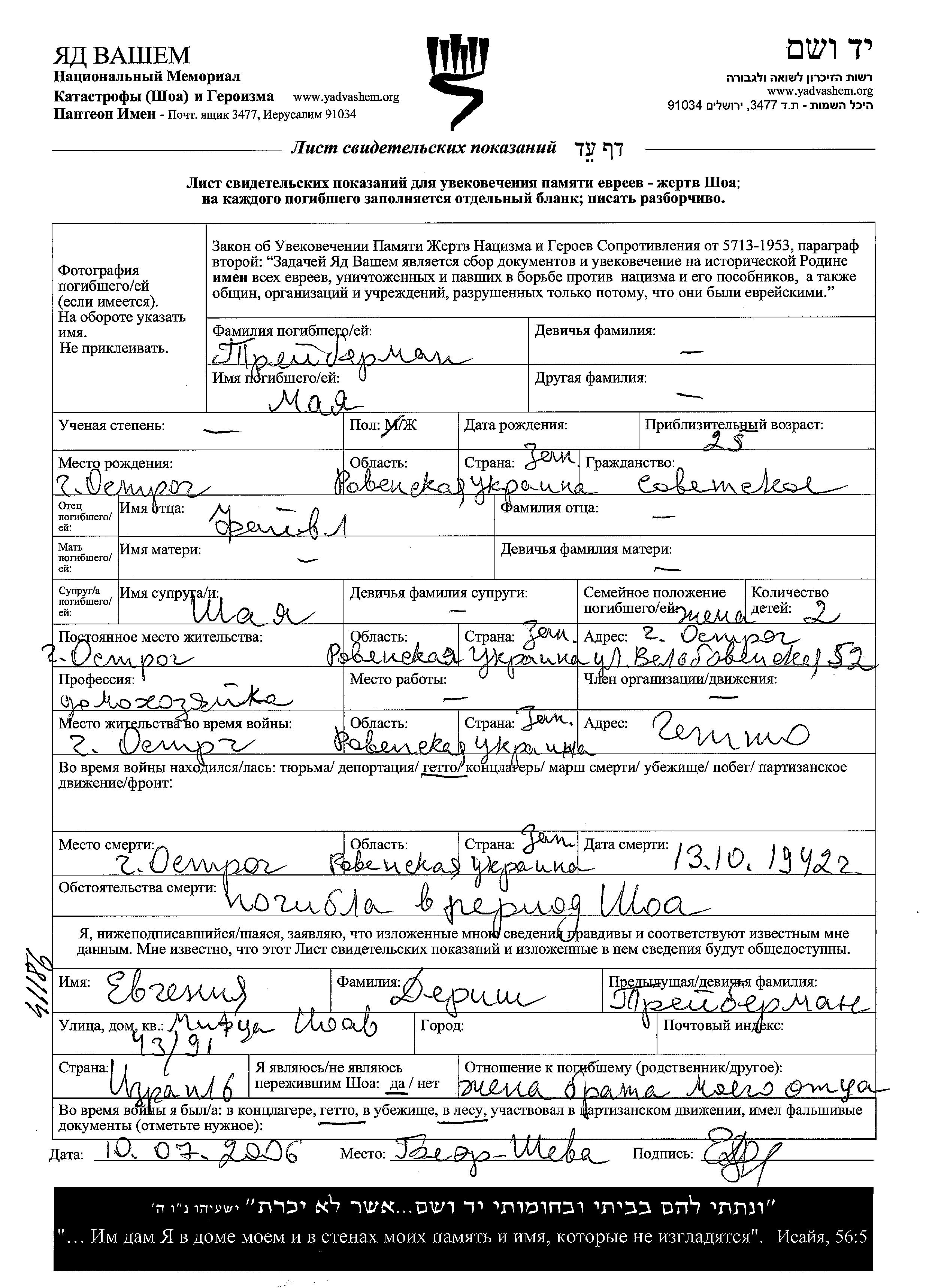 Maya wurde in der Schoah ermordet. Todesort: Ostrog, Polen im Jahr 13/10/1942.