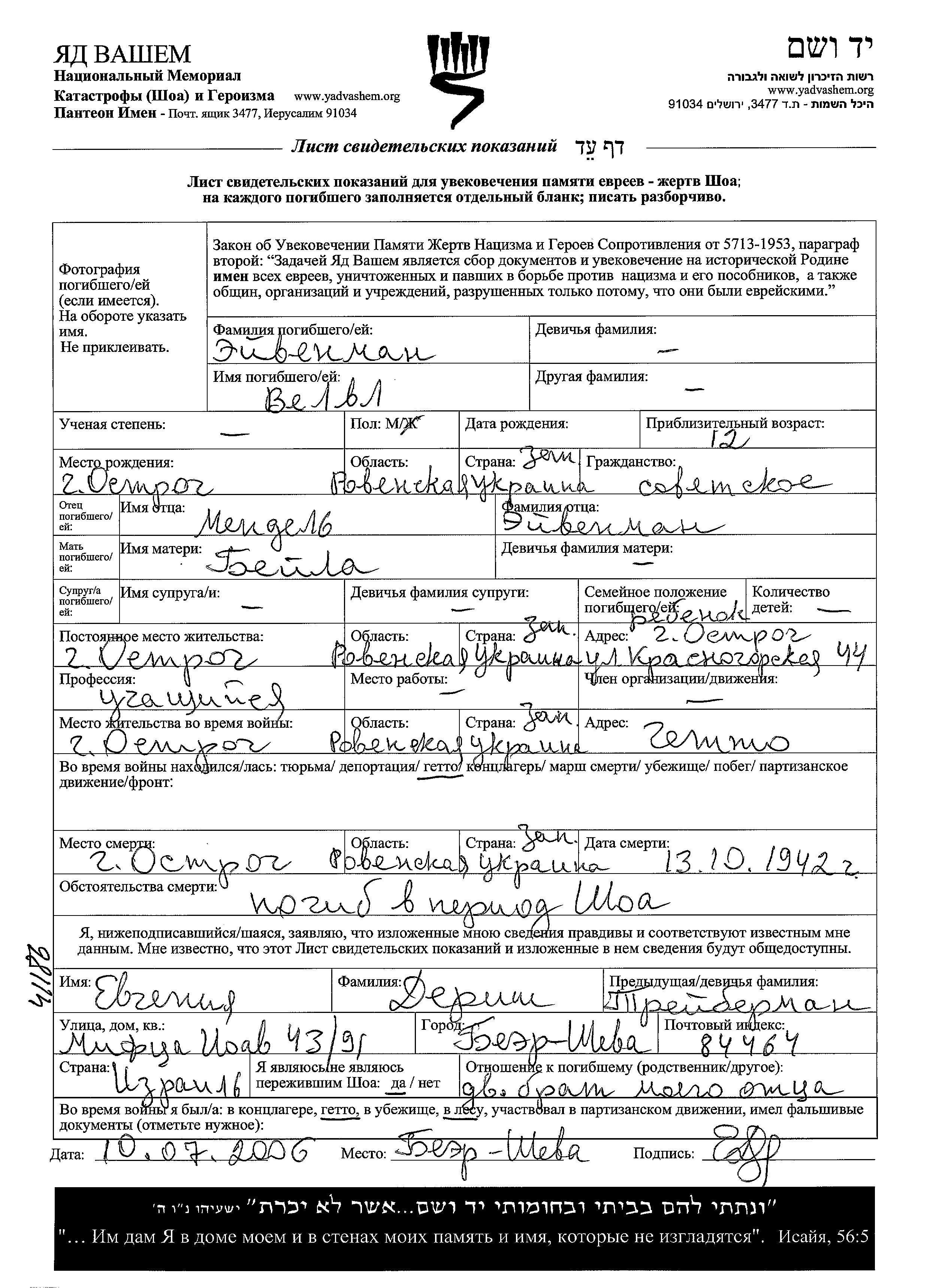 Velvl wurde in der Schoah ermordet. Todesort: Ostrog, Polen im Jahr 13/10/1942.