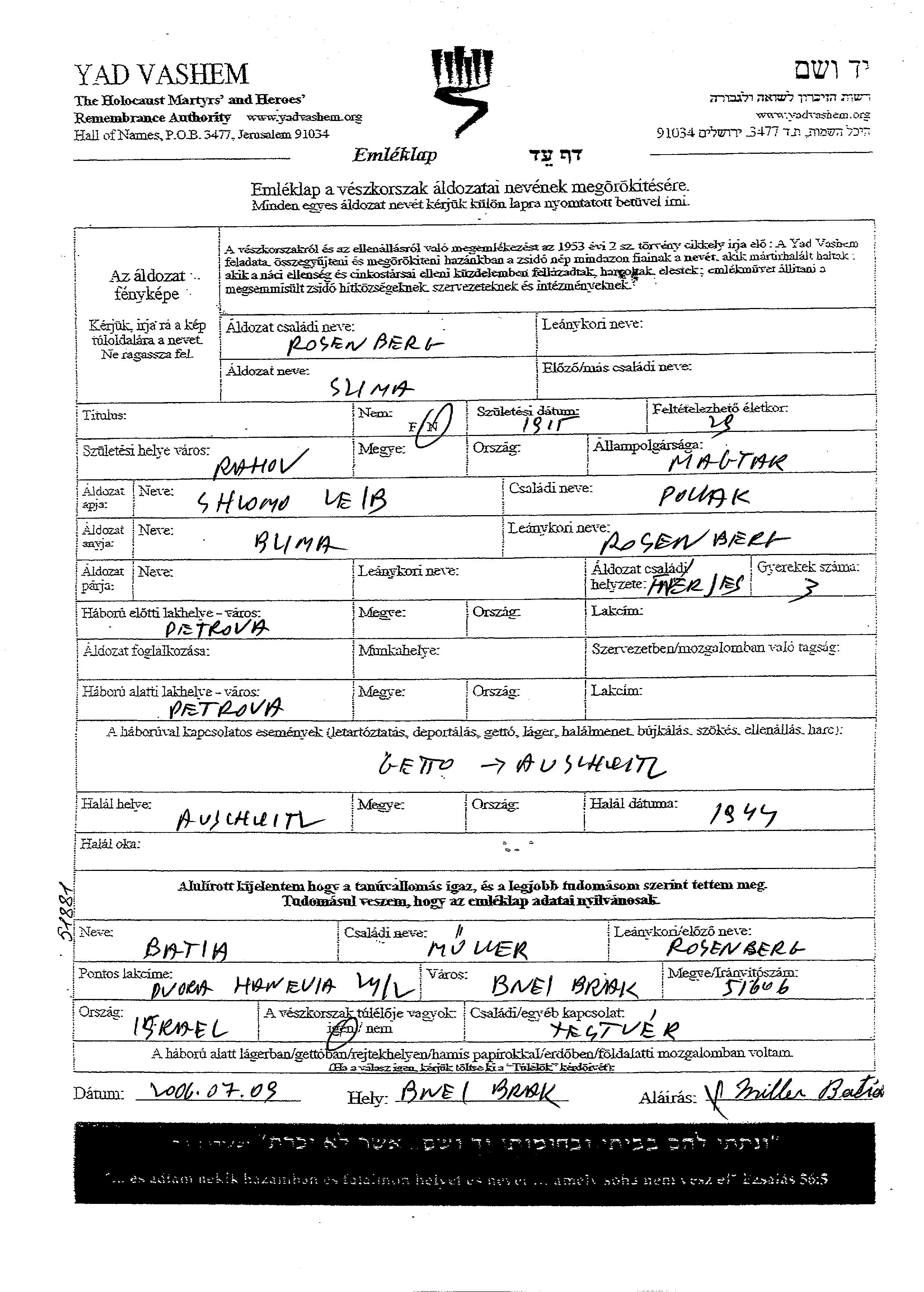 Szima wurde in der Schoah ermordet. Todesort: Auschwitz, Polen im Jahr 1944.