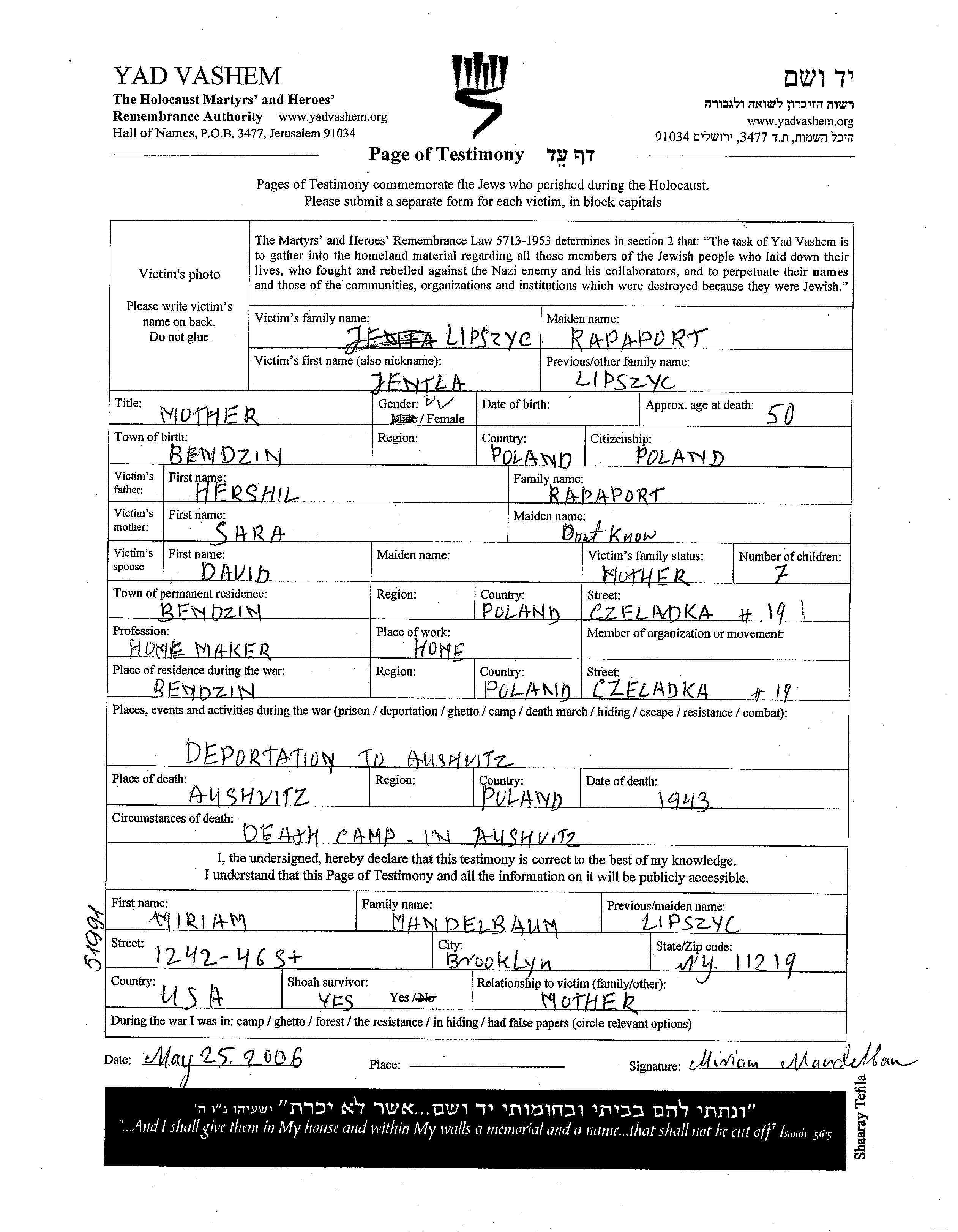 Jentla Lipszyc, geb. Rapaport wurde in Bendzin, Polen geboren. Sie war die Tochter von Hershil und Sara. Sie war Hausfrau und mit David Verheiratet. Vor dem Zweiten Weltkrieg lebte sie in Bendzin, Polen. Während des Krieges war sie in Bendzin, Polen.
