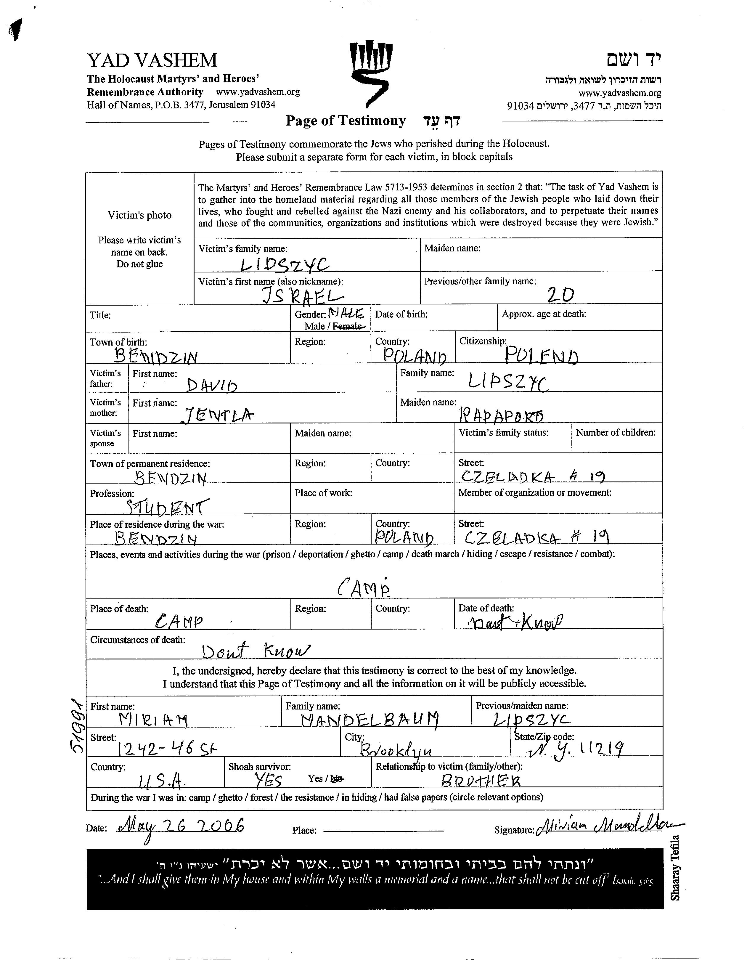 Israel Lipszyc wurde in Bendzin, Polen geboren. Er war der Sohn von David und Jentla, geb. Rapaport. Er war Student. Vor dem Zweiten Weltkrieg lebte er in Bendzin, Polen. Während des Krieges war er in Bendzin, Polen.
