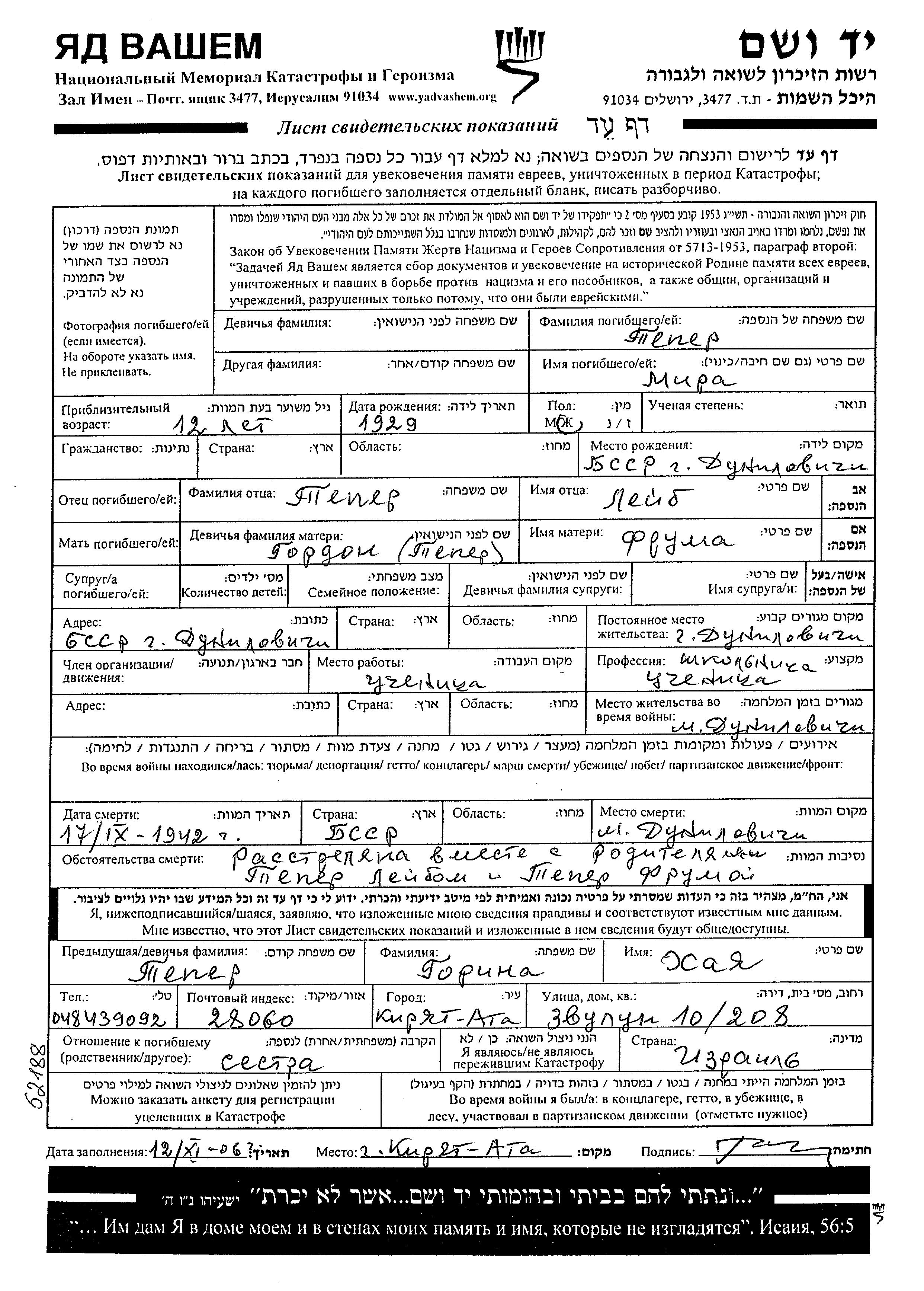 Mira Teper wurde im Jahr 1929 in Dunilovichi, Polen geboren. Sie war die Tochter von Leib und Fruma, geb. Gordon. Sie war Schüler/-in und Kind. Vor dem Zweiten Weltkrieg lebte sie in Dunilovichi, Polen. Während des Krieges war sie in Dunilovichi, Polen.