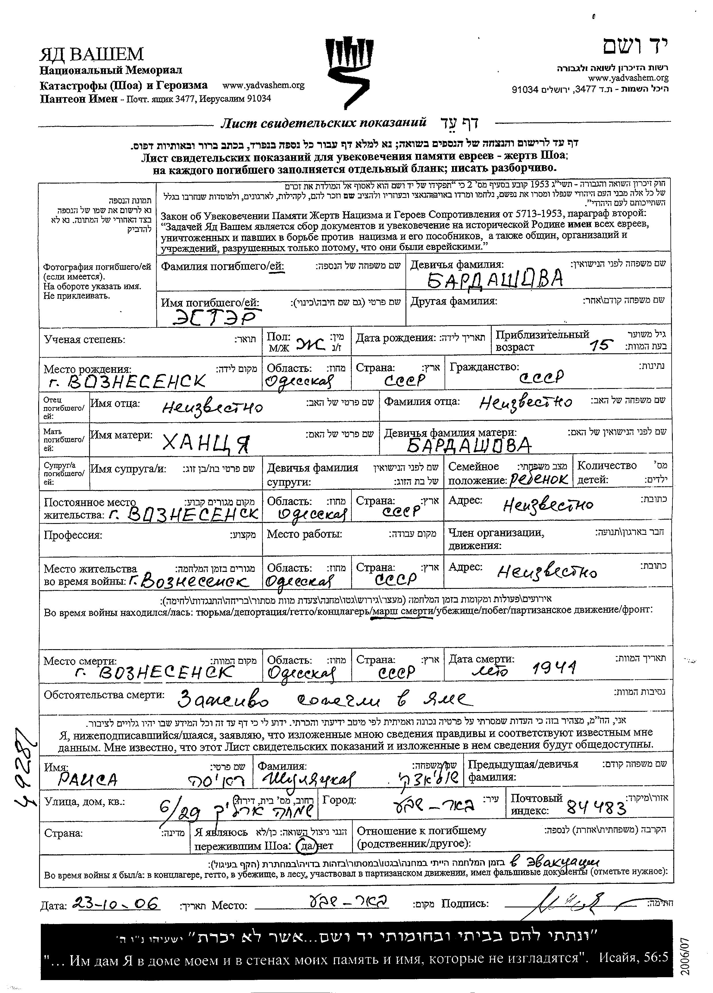 Bardashova Ester Voznesensk, Ukraine (UdSSR) Gedenkblatt