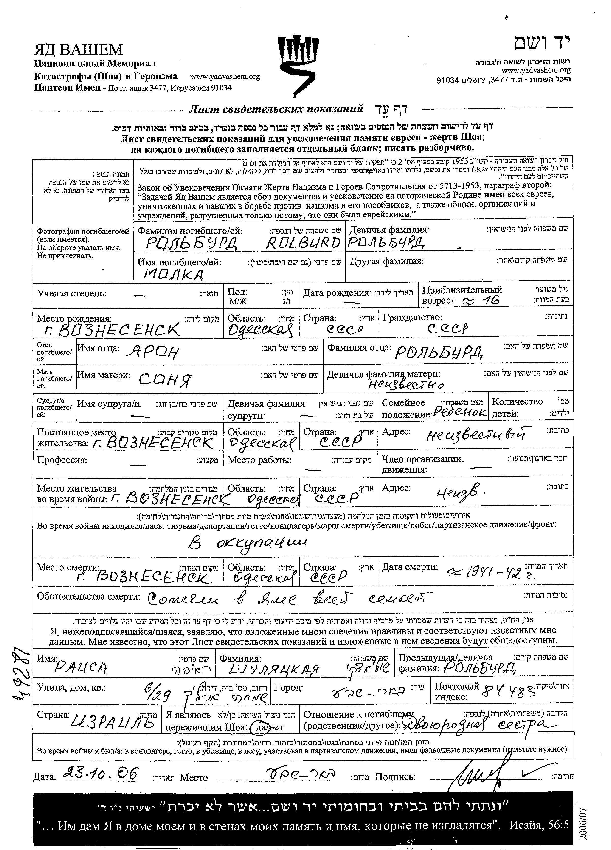 Malka Rolburd wurde Sie war die Tochter von Aron und Sonya. Sie war Jugendliche/-r. Vor dem Zweiten Weltkrieg lebte sie in Voznesensk, Ukraine (UdSSR). Während des Krieges war sie in Voznesensk, Ukraine (UdSSR).