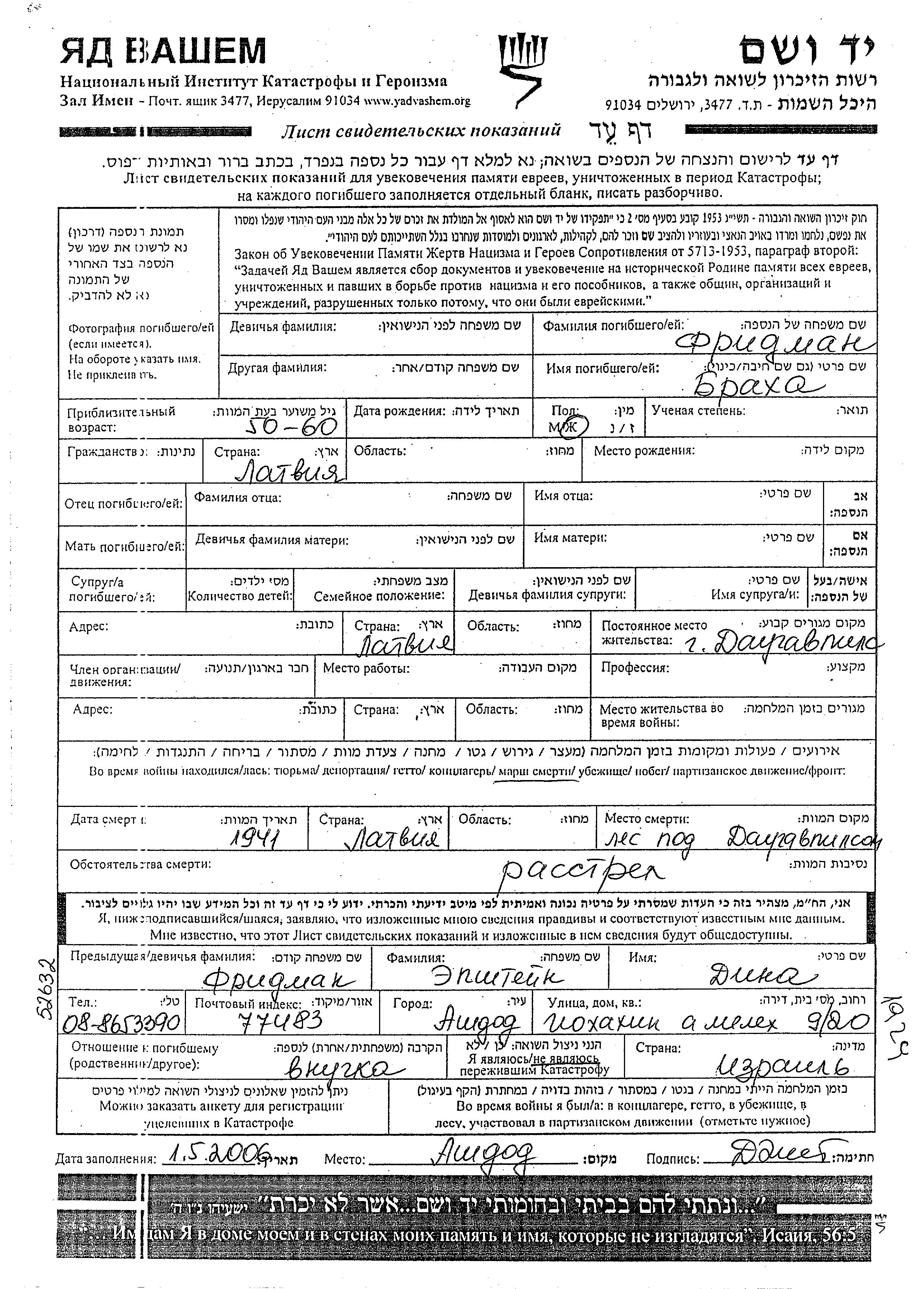 Fridman Brakha Daugavpils, Lettland Gedenkblatt