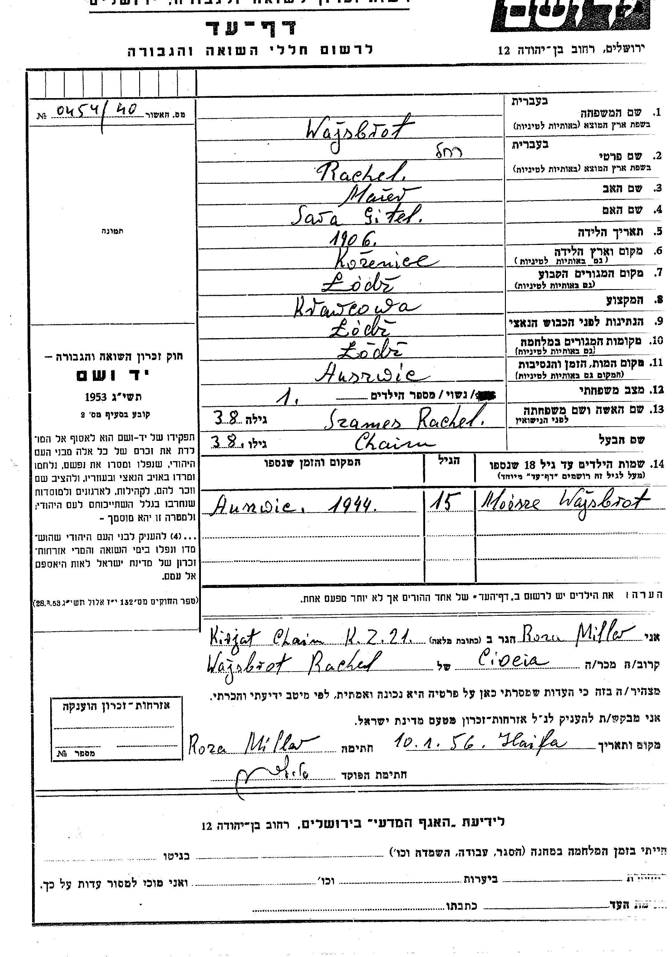 Rachel Wajsbrot, geb. Szames wurde im Jahr 1906 in Kozenitsy, Polen geboren. Sie war die Tochter von Maier und Sara Gitel. Sie war Schneiderin und mit Chaim Verheiratet. Vor dem Zweiten Weltkrieg lebte sie in Lodz, Polen. Während des Krieges war sie in Lodz, Polen.