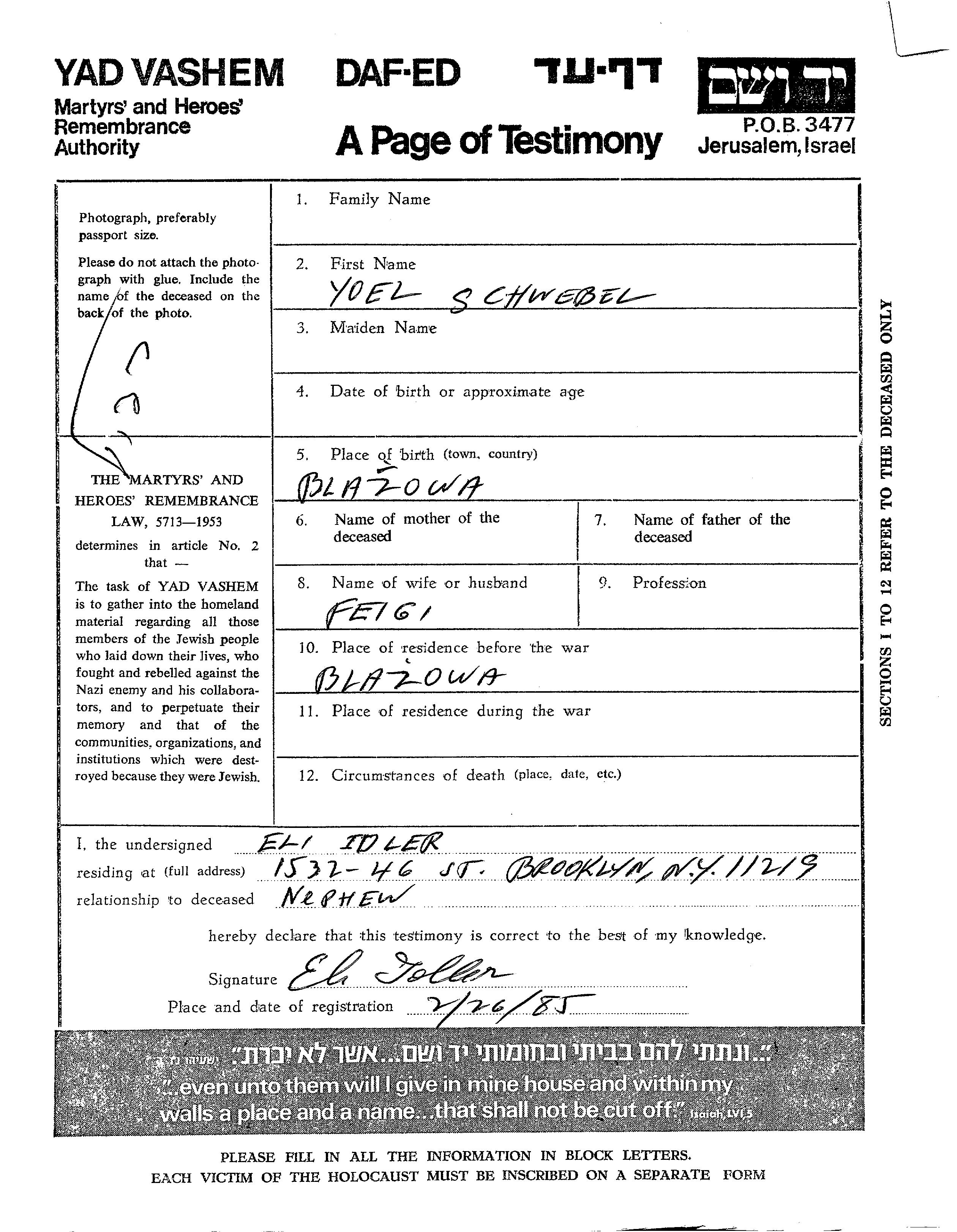 Yoel Schwebel wurde in Blazowa, Polen geboren. Vor dem Zweiten Weltkrieg lebte er in Blazowa, Polen.