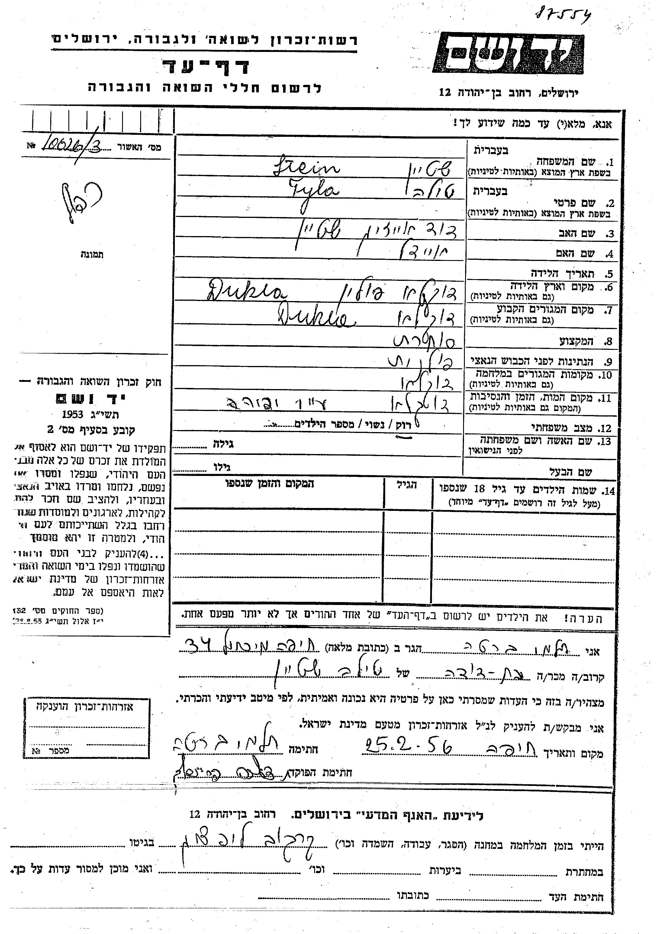 Tyla Stein wurde in Dukla, Polen geboren. Sie war die Tochter von David Aizik und Eidel. Sie war Kaufmann/-frau und Ledig. Vor dem Zweiten Weltkrieg lebte sie in Dukla, Polen. Während des Krieges war sie in Dukla, Polen.