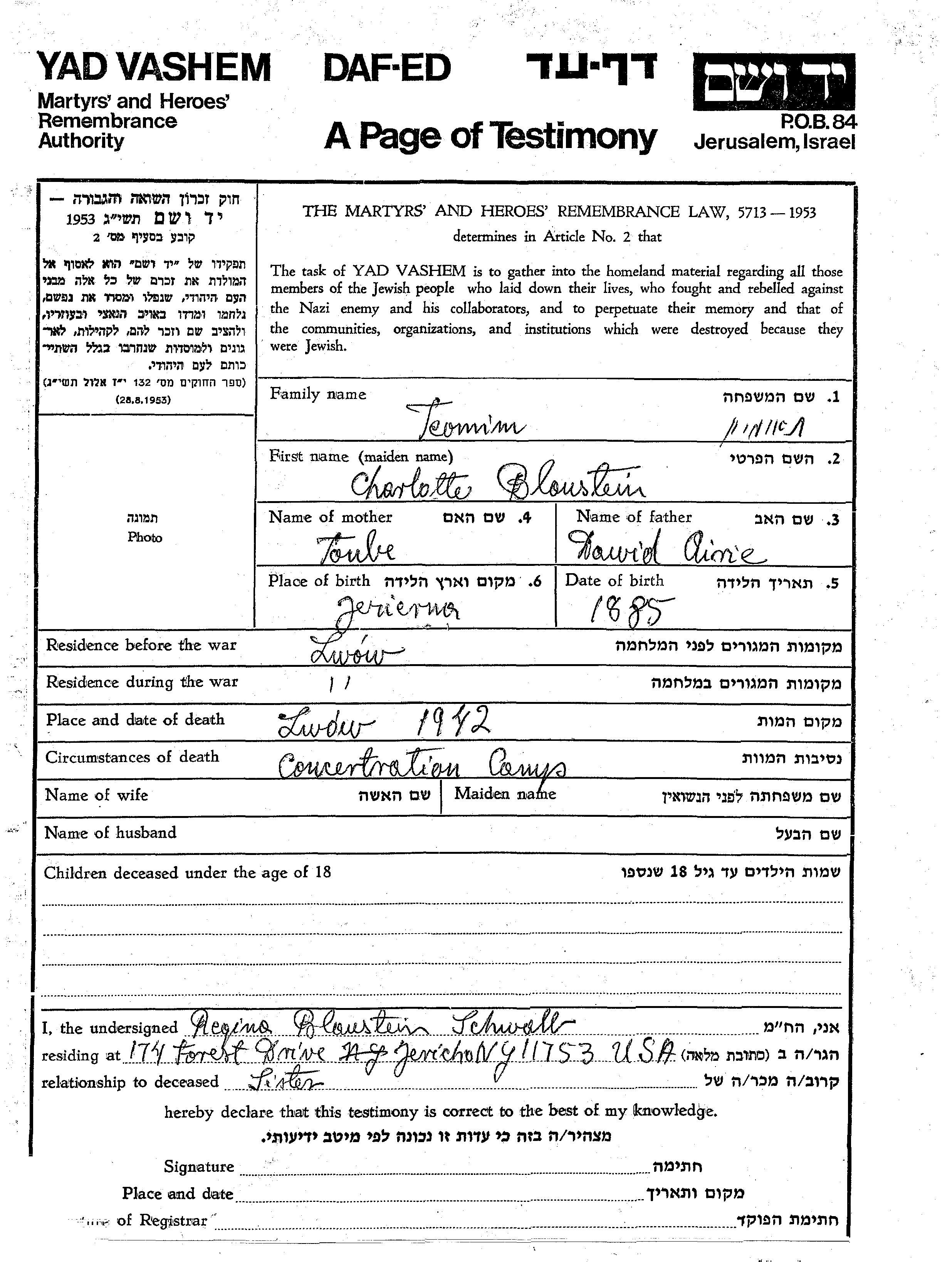 Charlotte Teomim, geb. Blaustein wurde im Jahr 1885 in Jezierna, Polen geboren. Sie war die Tochter von Dawid Airie und Tauba. Vor dem Zweiten Weltkrieg lebte sie in Lwow, Polen. Während des Krieges war sie in Lwow, Polen.