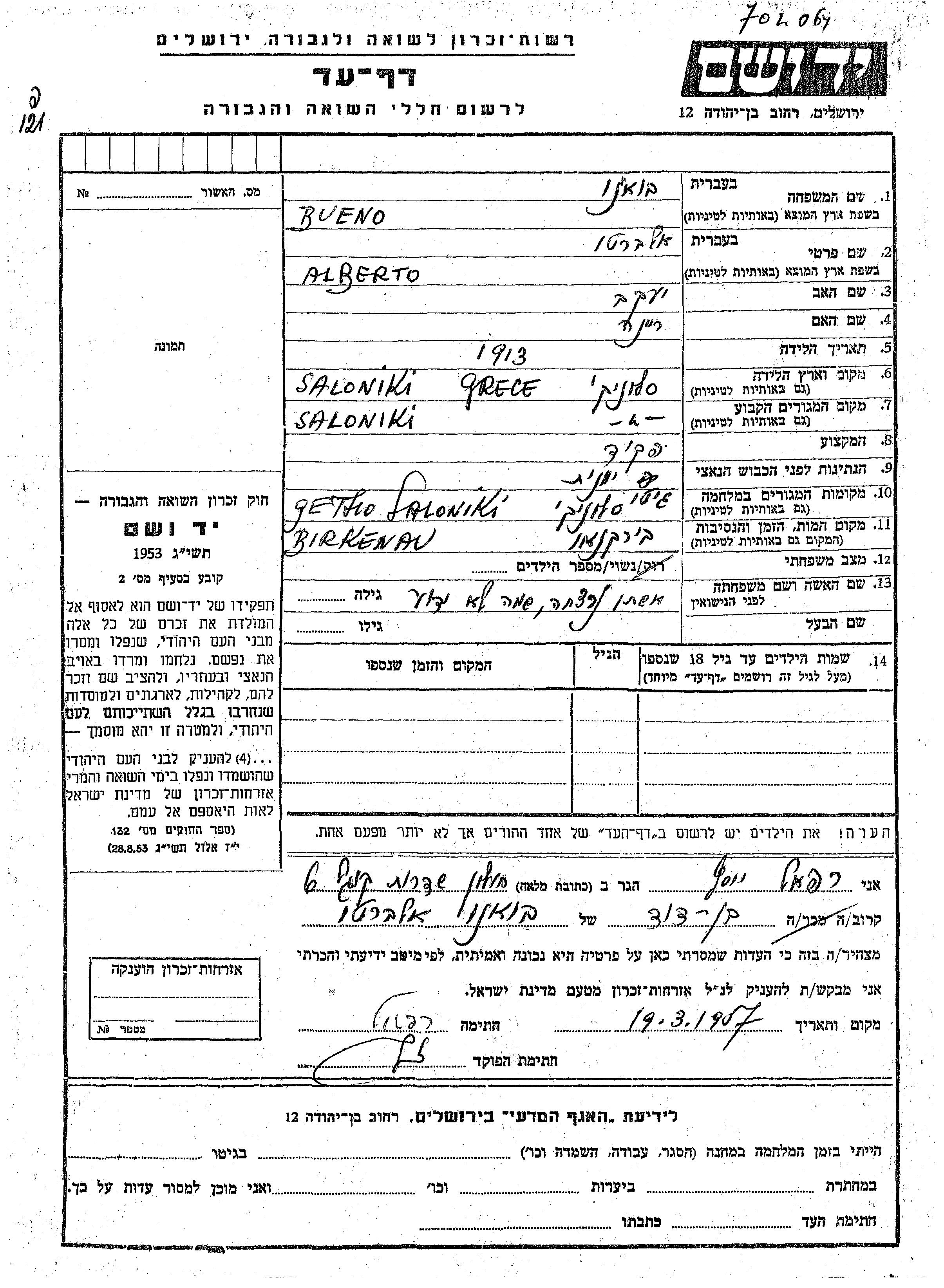 Alberto Bueno wurde im Jahr 1913 in Salonika, Griechenland geboren. Er war der Sohn von Yaakov und Reina. Er war Angestellte/-r und Verheiratet. Vor dem Zweiten Weltkrieg lebte er in Saloniki, Griechenland. Während des Krieges war er in Salonika, Griechenland.