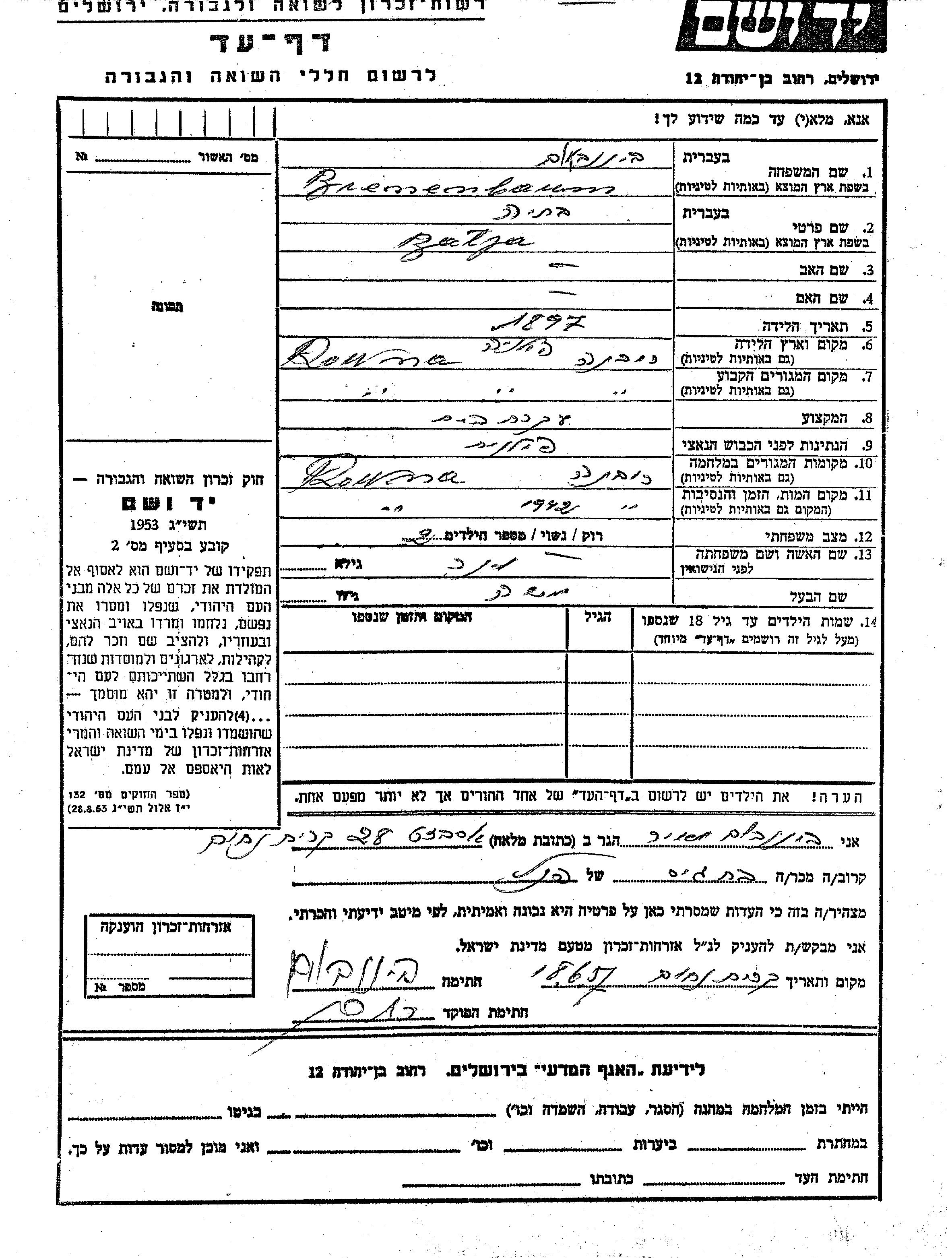 Batya Binenbaum, geb. Viner wurde im Jahr 1897 in Rowna, Polen geboren. Sie war Hausfrau und mit Moshe Verheiratet. Vor dem Zweiten Weltkrieg lebte sie in Rowna, Polen. Während des Krieges war sie in Rowna, Polen.