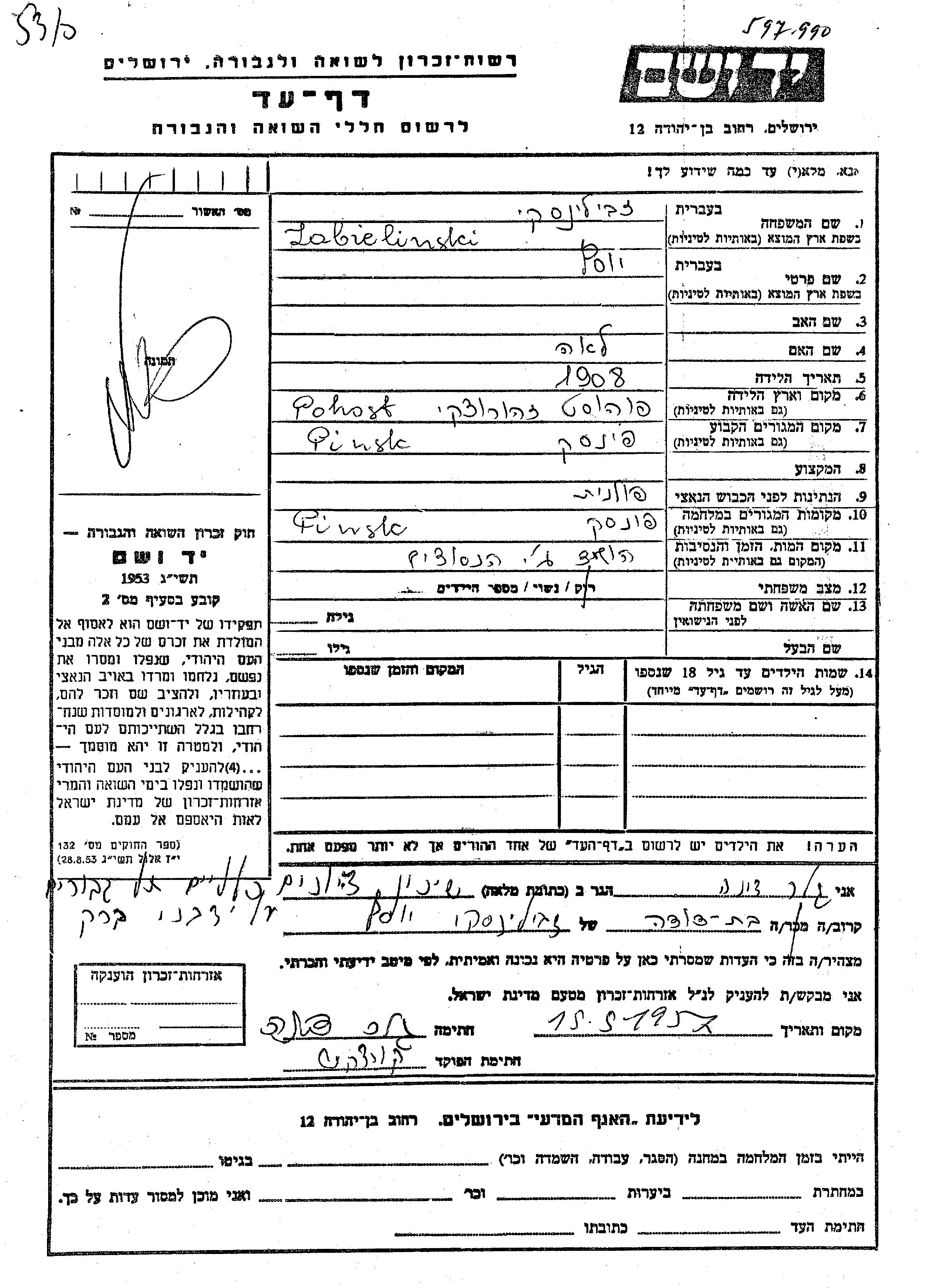 Zabielinski Yosef 1908 Pinsk, Polen Gedenkblatt