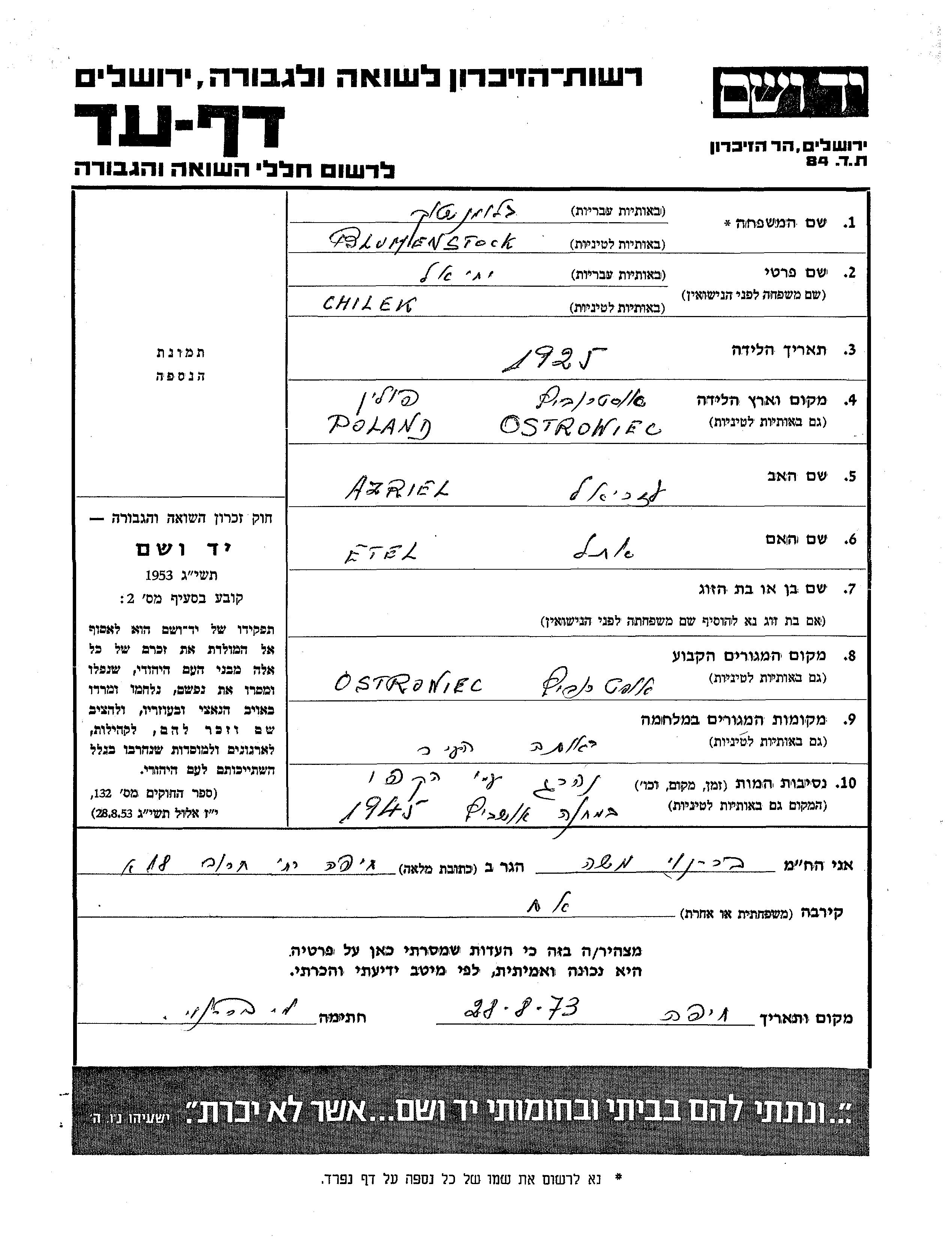 Chilek Blumenstock wurde im Jahr 1925 in Ostrowiec, Polen geboren. Er war der Sohn von Azriel und Etel. Vor dem Zweiten Weltkrieg lebte er in Ostrowiec, Polen. Während des Krieges war er in Ostrowiec, Polen.