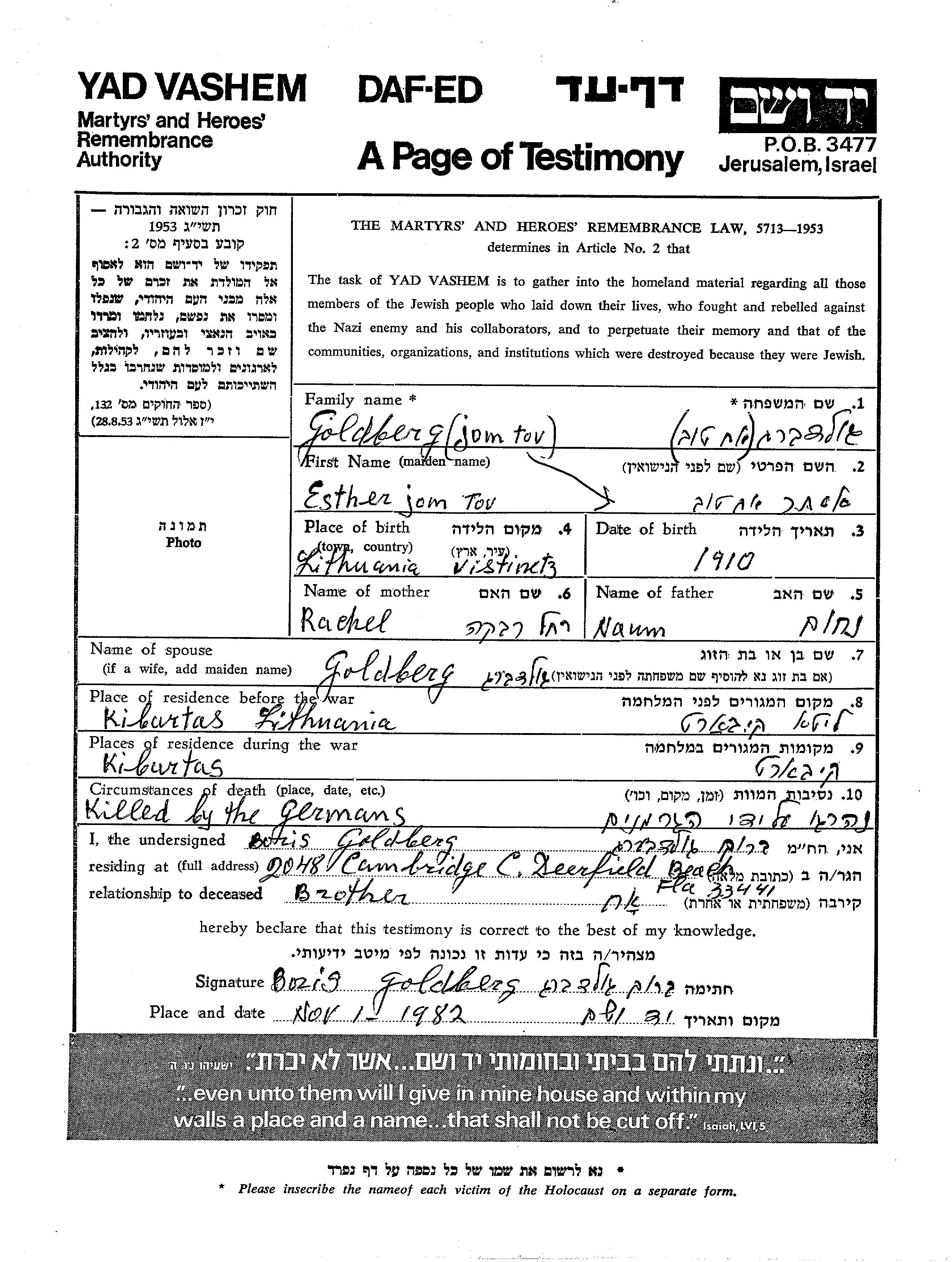 Esther Jomtov, geb. Goldberg wurde im Jahr 1910 in Vistytis, Litauen geboren. Sie war die Tochter von Nakhum und Rachel Rivka. Sie war Verheiratet. Vor dem Zweiten Weltkrieg lebte sie in Kibart, Litauen. Während des Krieges war sie in Kibart, Litauen.