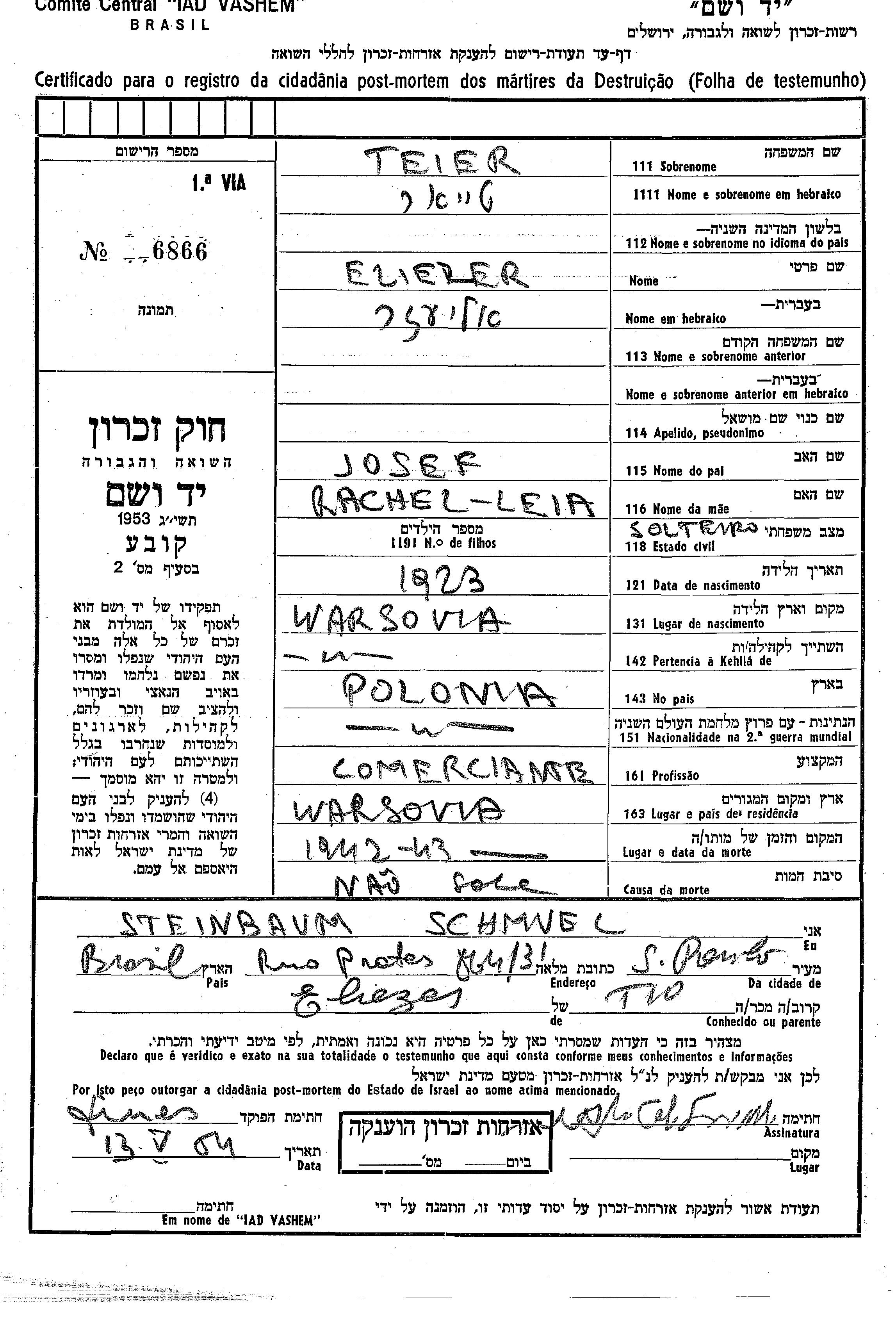 Eliezer Teier wurde im Jahr 1923 in Warszawa, Polen geboren. Er war der Sohn von Josef und Rachel Leia. Er war Kaufmann/-frau und Ledig. Vor dem Zweiten Weltkrieg lebte er in Warszawa, Polen. Während des Krieges war er in Warszawa, Polen.