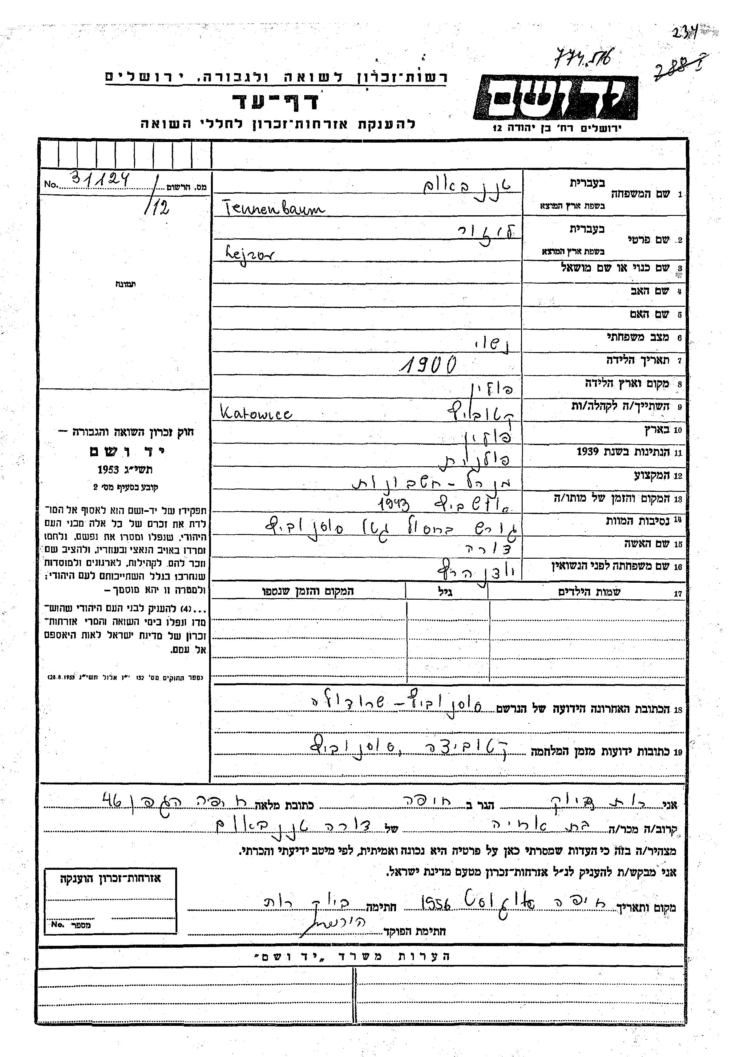 Lejzor Tennenbaum wurde im Jahr 1900 in Polen geboren. Er war Buchhalter/-in und mit Dora, geb. Iudenhertz Verheiratet. Vor dem Zweiten Weltkrieg lebte er in Katowice, Polen. Während des Krieges war er in Sosnowiec, Polen.