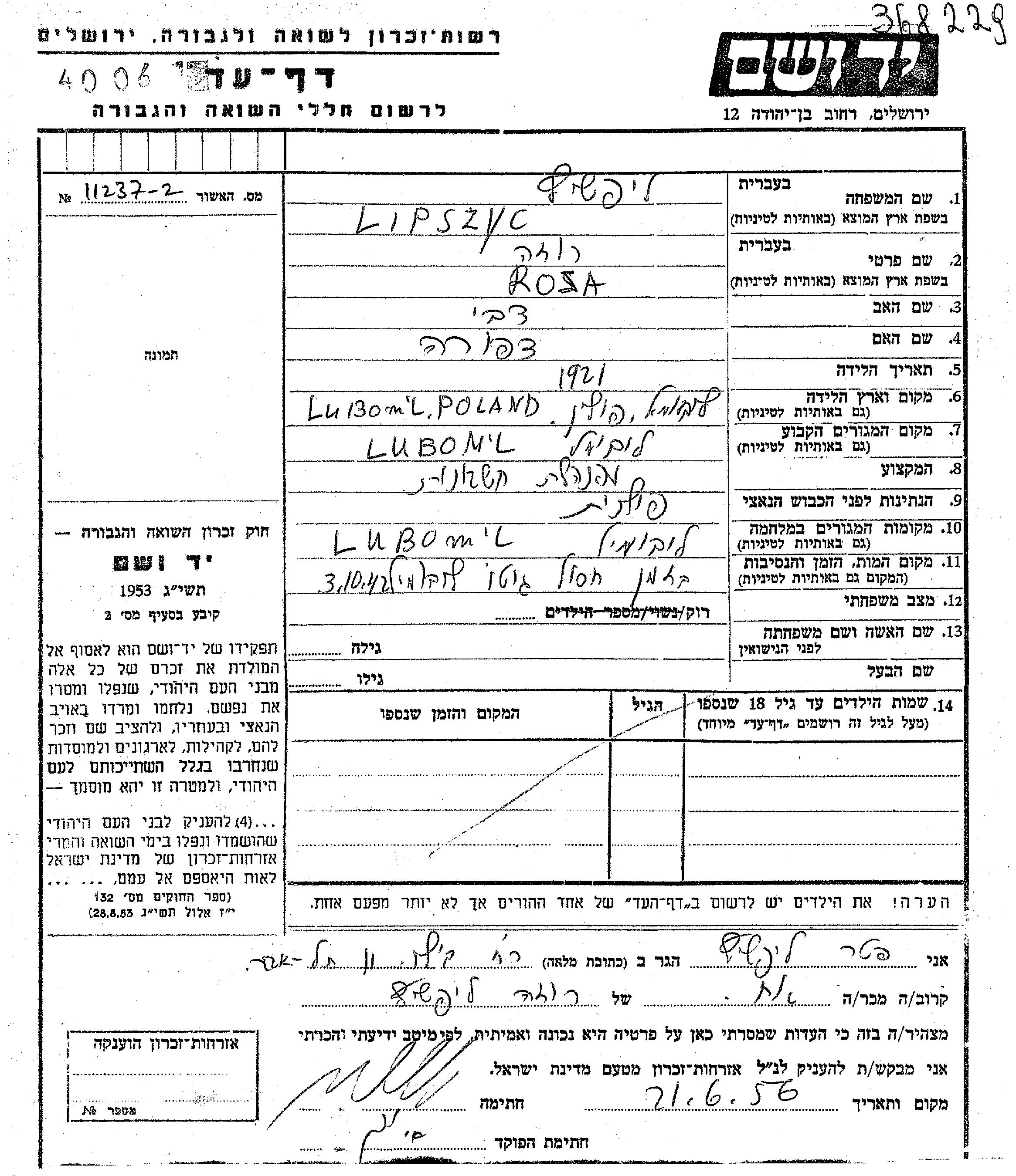 Roza Lipszyc wurde im Jahr 1921 in Luboml, Polen geboren. Sie war die Tochter von Tzvi und Tzipora. Sie war Buchhalter/-in und Ledig. Vor dem Zweiten Weltkrieg lebte sie in Luboml, Polen. Während des Krieges war sie in Luboml, Polen.