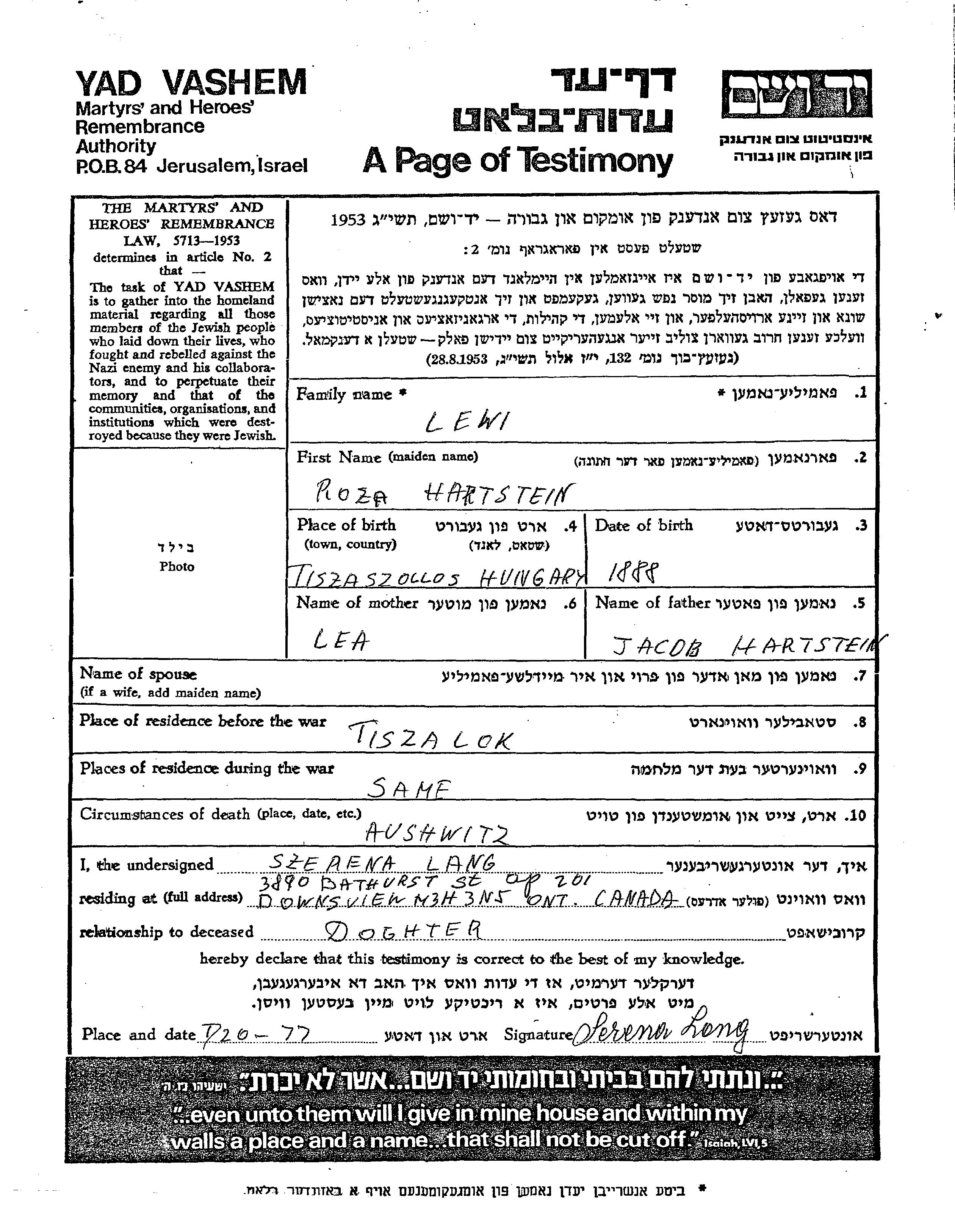 Roza Lewi, geb. Hartstein wurde im Jahr 1888 in Tiszaszollos, Ungarn geboren. Sie war die Tochter von Jacob und Lea. Vor dem Zweiten Weltkrieg lebte sie in Tiszalok, Ungarn. Während des Krieges war sie in Tiszalok, Ungarn.