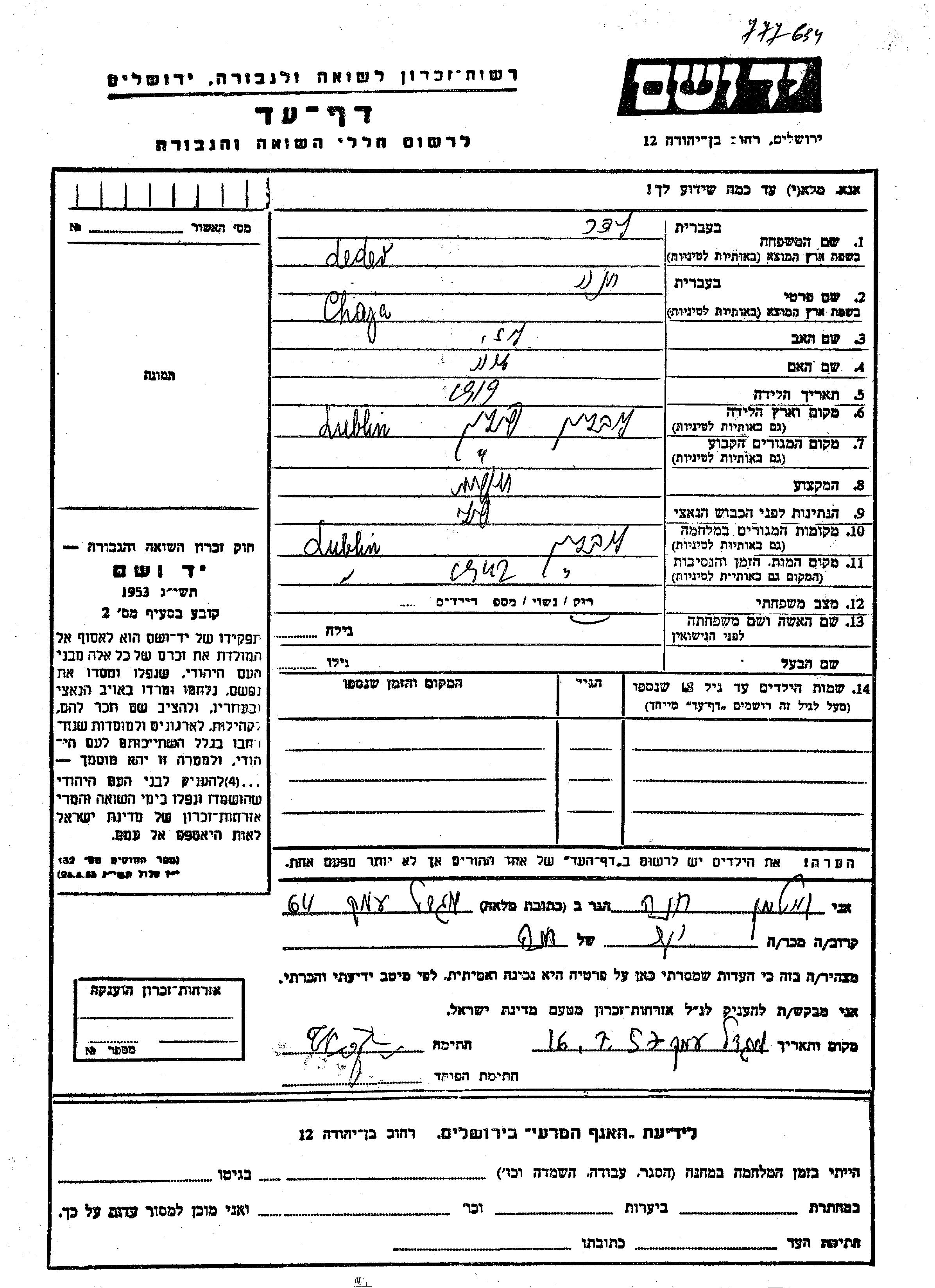 Chaja Khana wurde in der Schoah ermordet. Todesort: Lublin, Polen im Jahr 1942.