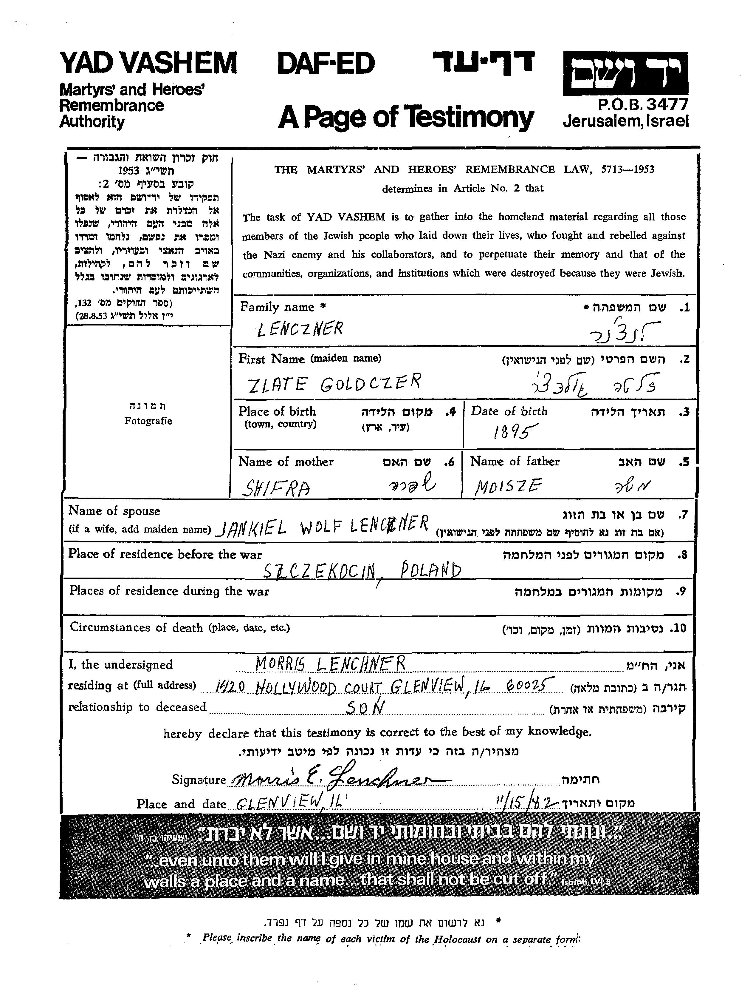 Zlate Lenczner, geb. Goldczer wurde im Jahr 1895 geboren. Sie war die Tochter von Moisze und Shifra. Vor dem Zweiten Weltkrieg lebte sie in Szczekocin, Polen.