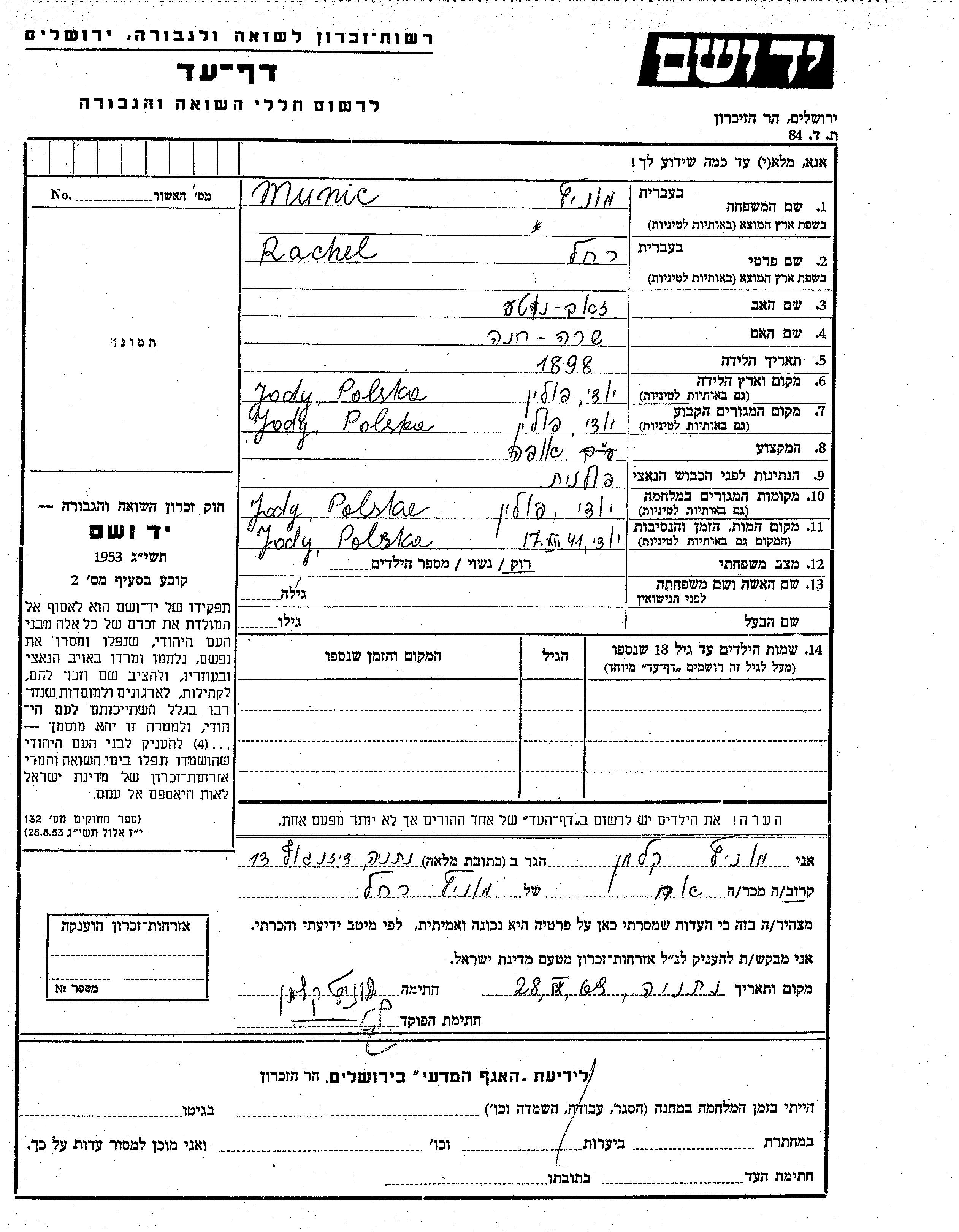 Rachel wurde in der Schoah ermordet. Todesort: Jody, Polen im Jahr 17/12/1941.