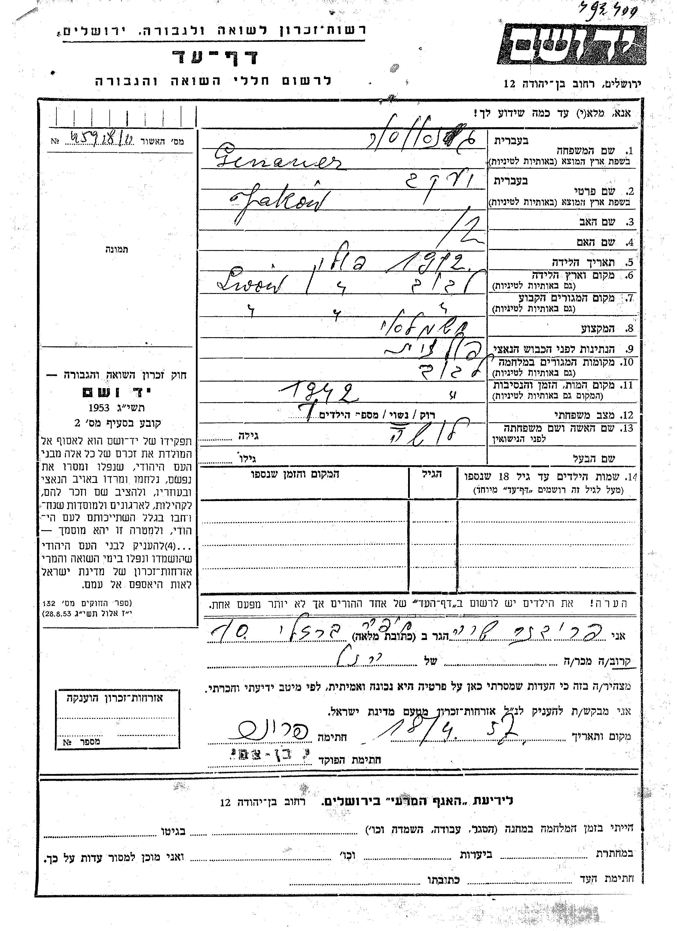 Yakow wurde in der Schoah ermordet. Todesort: Lwow, Polen im Jahr 1942.