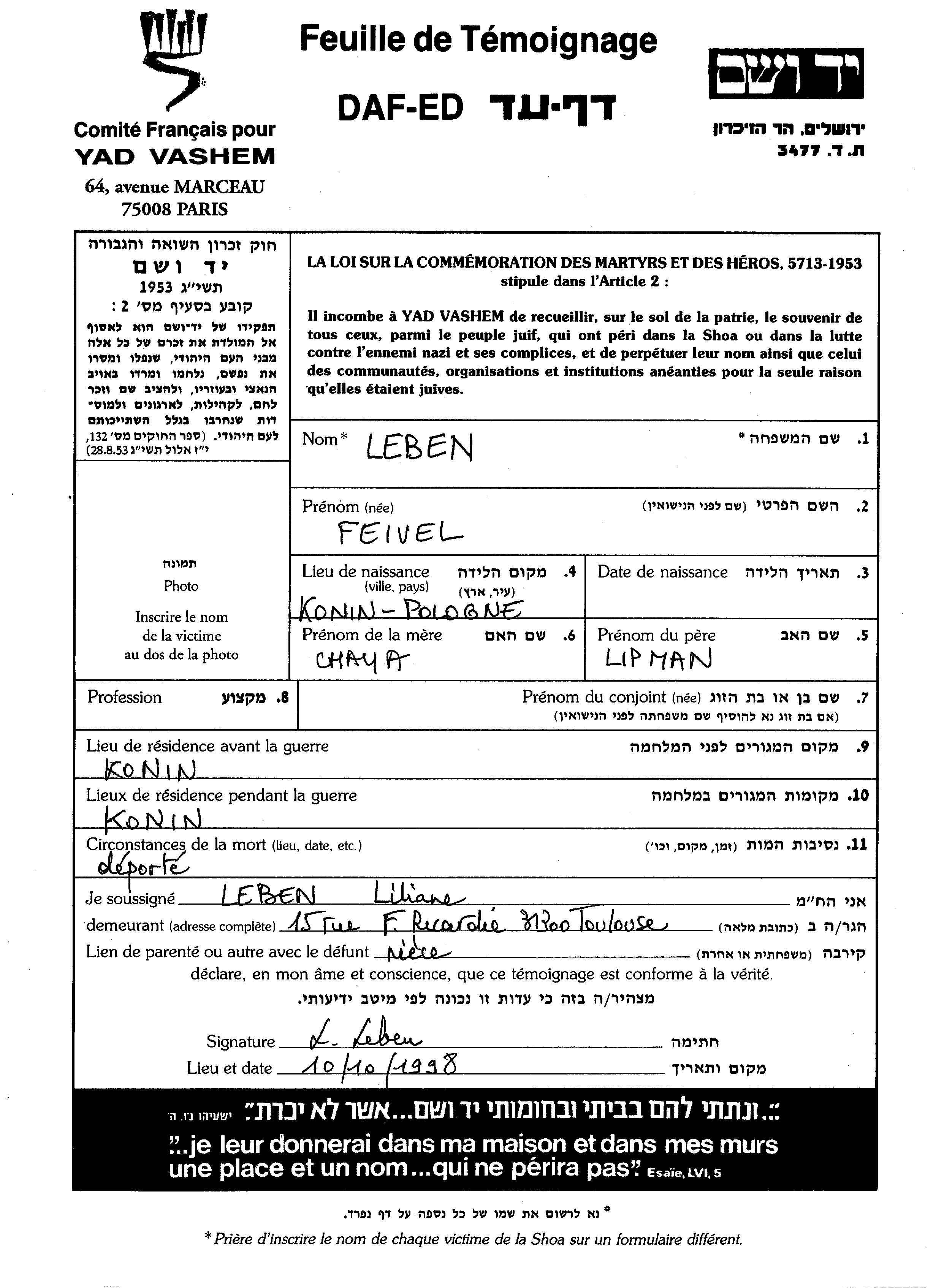 Faivel Leben wurde in Konin, Polen geboren. Er war der Sohn von Lipman und Chaya. Vor dem Zweiten Weltkrieg lebte er in Konin, Polen. Während des Krieges war er in Konin, Polen.
