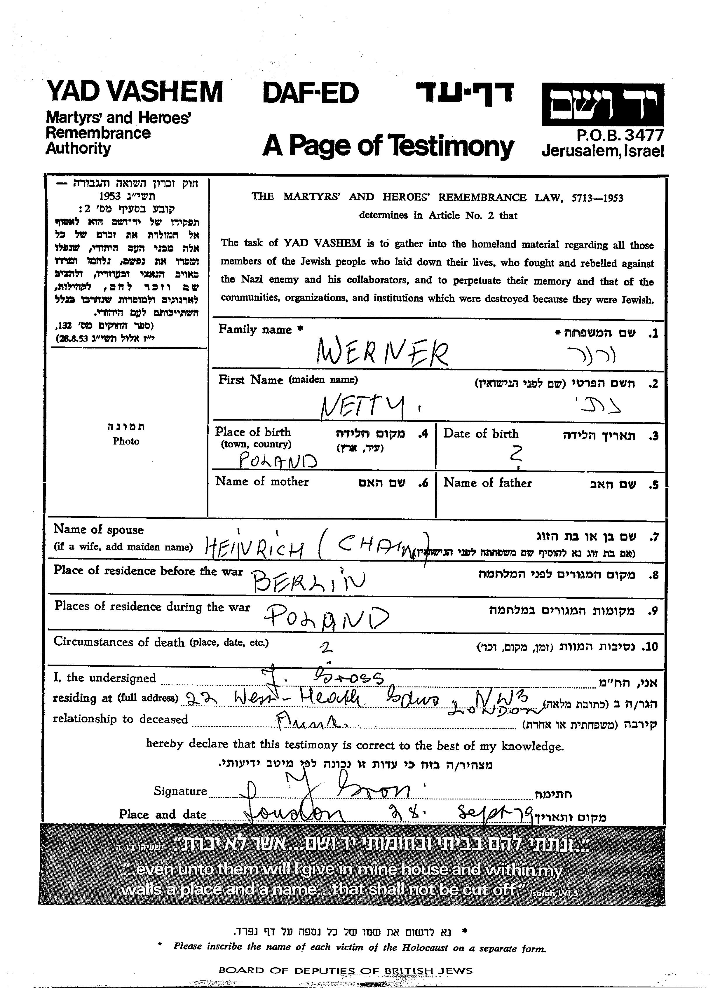Netty Werner wurde in Polen geboren. Vor dem Zweiten Weltkrieg lebte sie in Berlin, Deutsches Reich. Während des Krieges war sie in Polen.