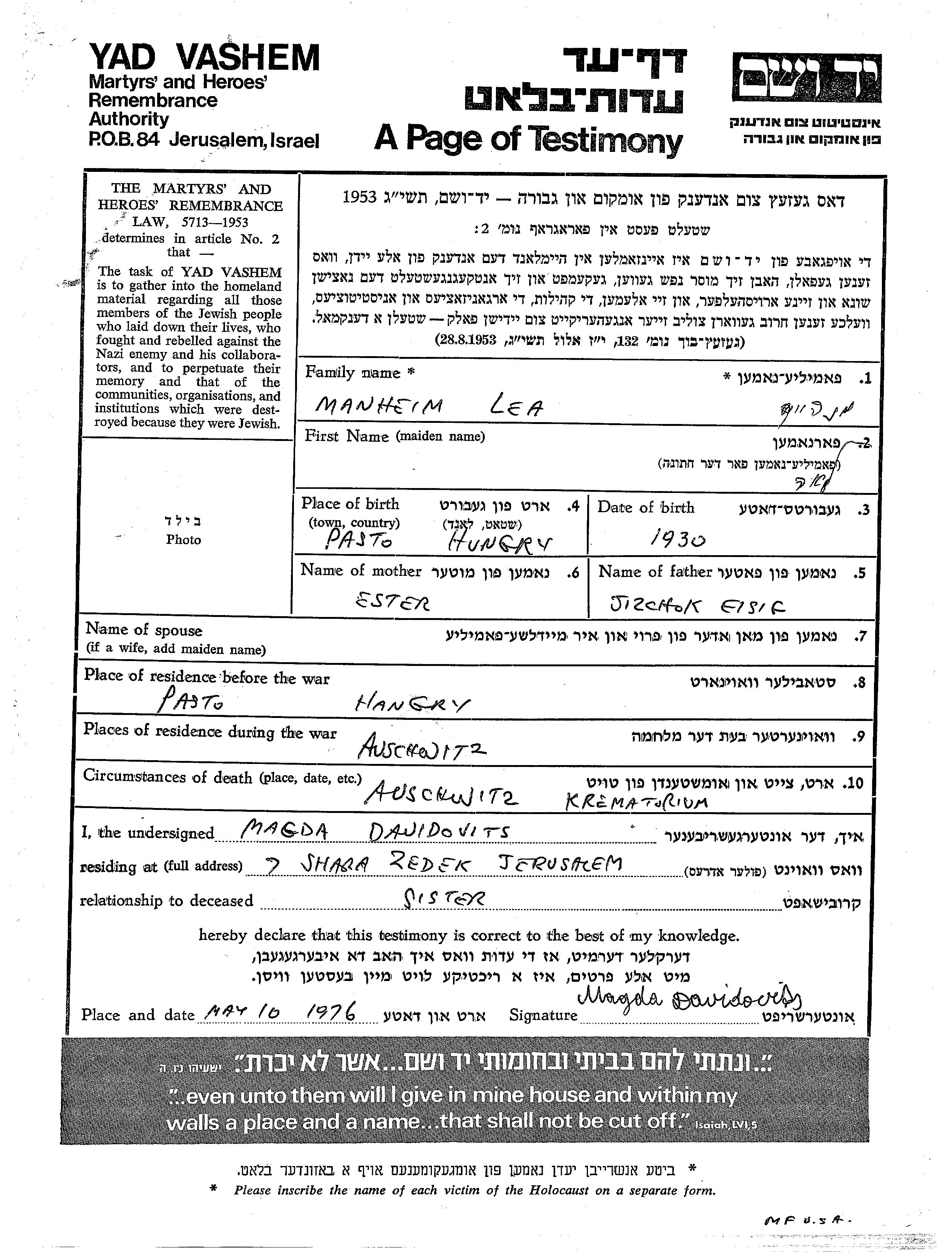 Lea Manheim wurde im Jahr 1930 in Pasto, Ungarn geboren. Sie war die Tochter von Jizchok Eisif und Ester. Vor dem Zweiten Weltkrieg lebte sie in Pasto, Ungarn. Während des Krieges war sie in Auschwitz, Polen.
