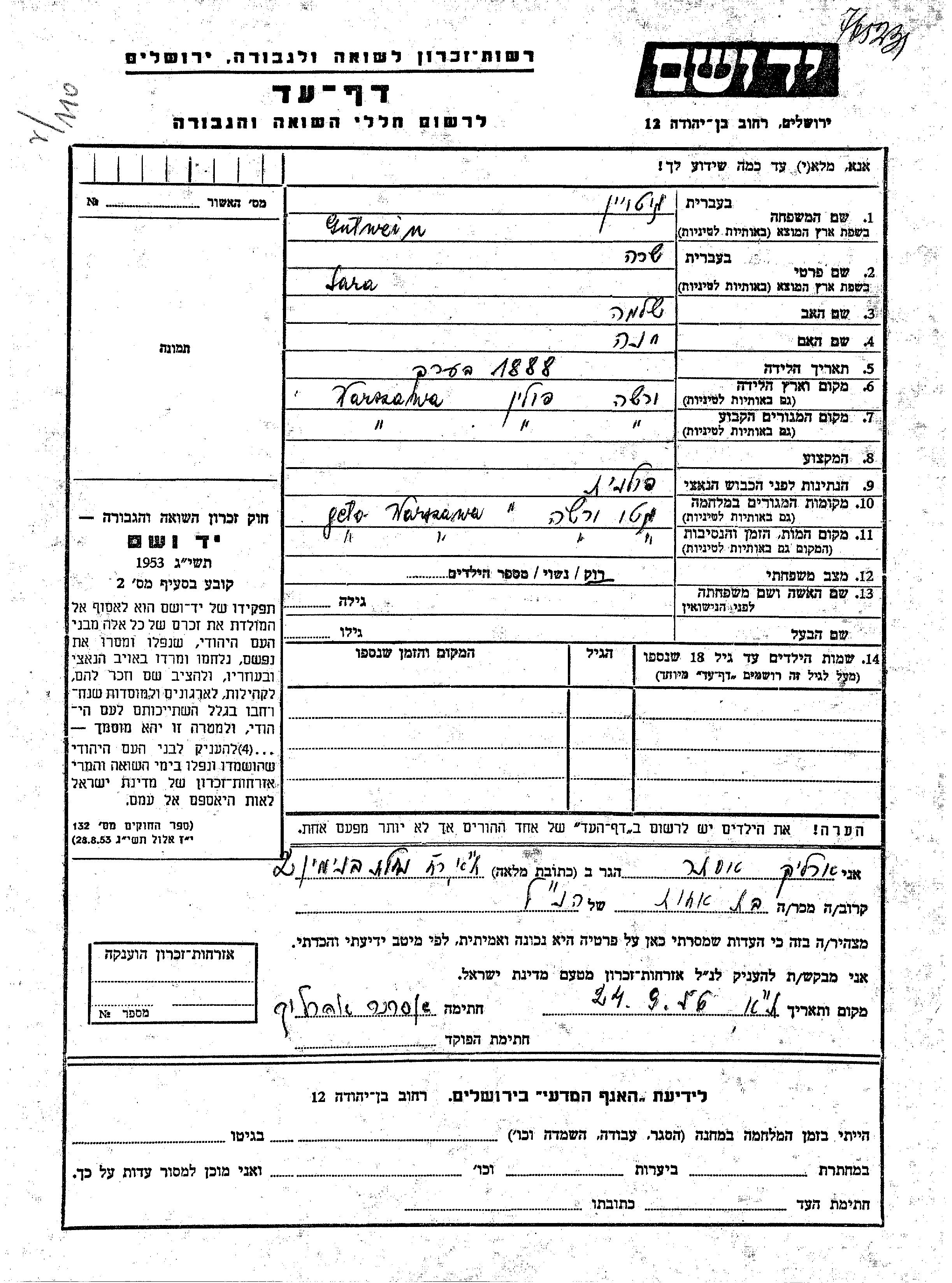 Sara Gutwein wurde im Jahr 1888 in Warszawa, Polen geboren. Sie war die Tochter von Shlomo und Khana. Sie war Ledig. Vor dem Zweiten Weltkrieg lebte sie in Warszawa, Polen. Während des Krieges war sie in Warszawa, Polen.