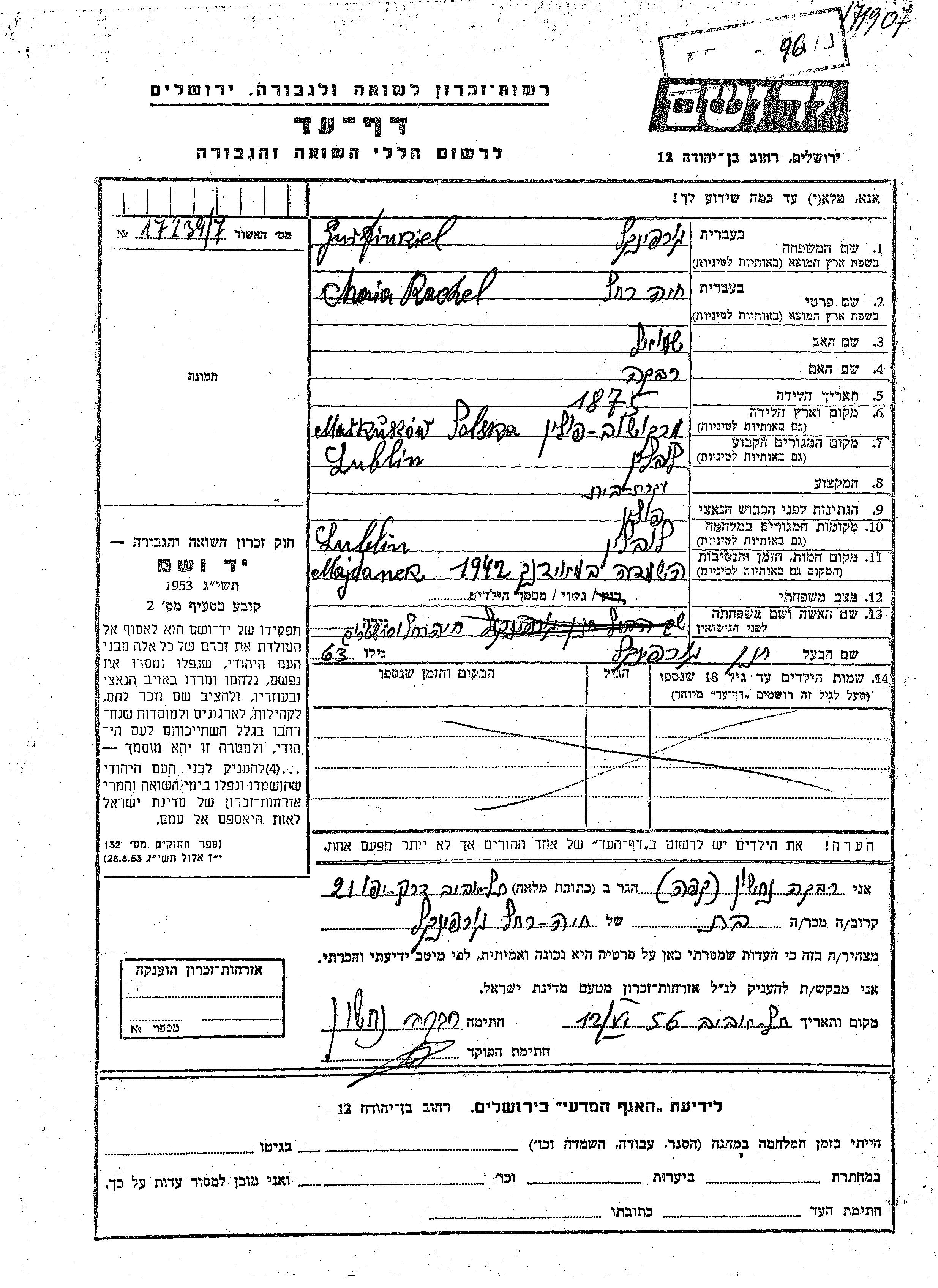 Chaia Rachel Gurfinkiel, geb. Vasershtrom wurde im Jahr 1875 in Markuszow, Polen geboren. Sie war die Tochter von Shmuel und Rivka. Sie war Hausfrau und mit Khanan Verheiratet. Vor dem Zweiten Weltkrieg lebte sie in Lublin, Polen. Während des Krieges war sie in Lublin, Polen.