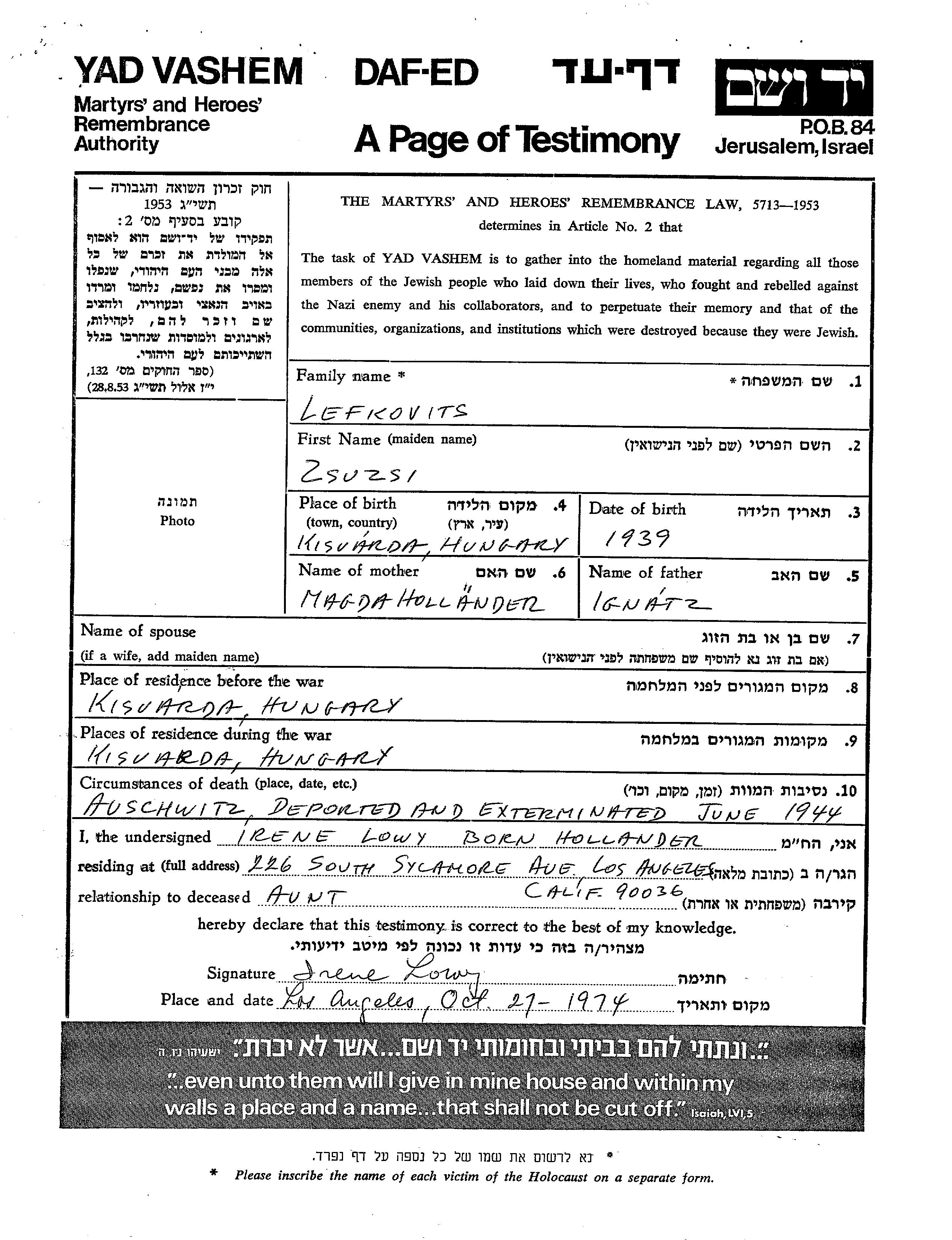 Lefkovits Zsuzsi 1939 Kisvarda, Ungarn Gedenkblatt
