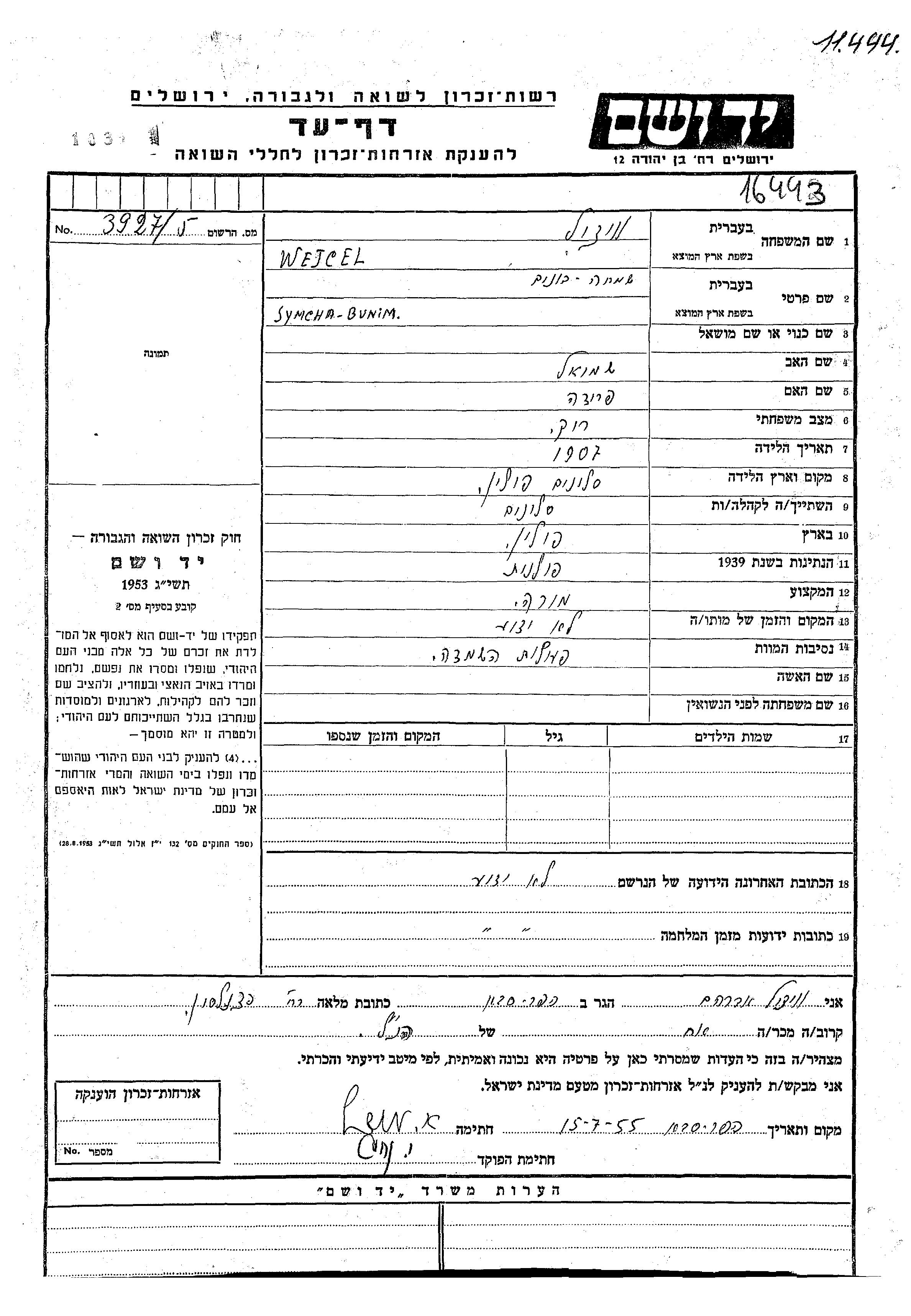 Symcha Bunim Wejcel Vizel wurde im Jahr 1907 in Slonim, Polen geboren. Er war der Sohn von Shmuel und Frida. Er war Lehrer/in und Ledig. Vor dem Zweiten Weltkrieg lebte er in Slonim, Polen.
