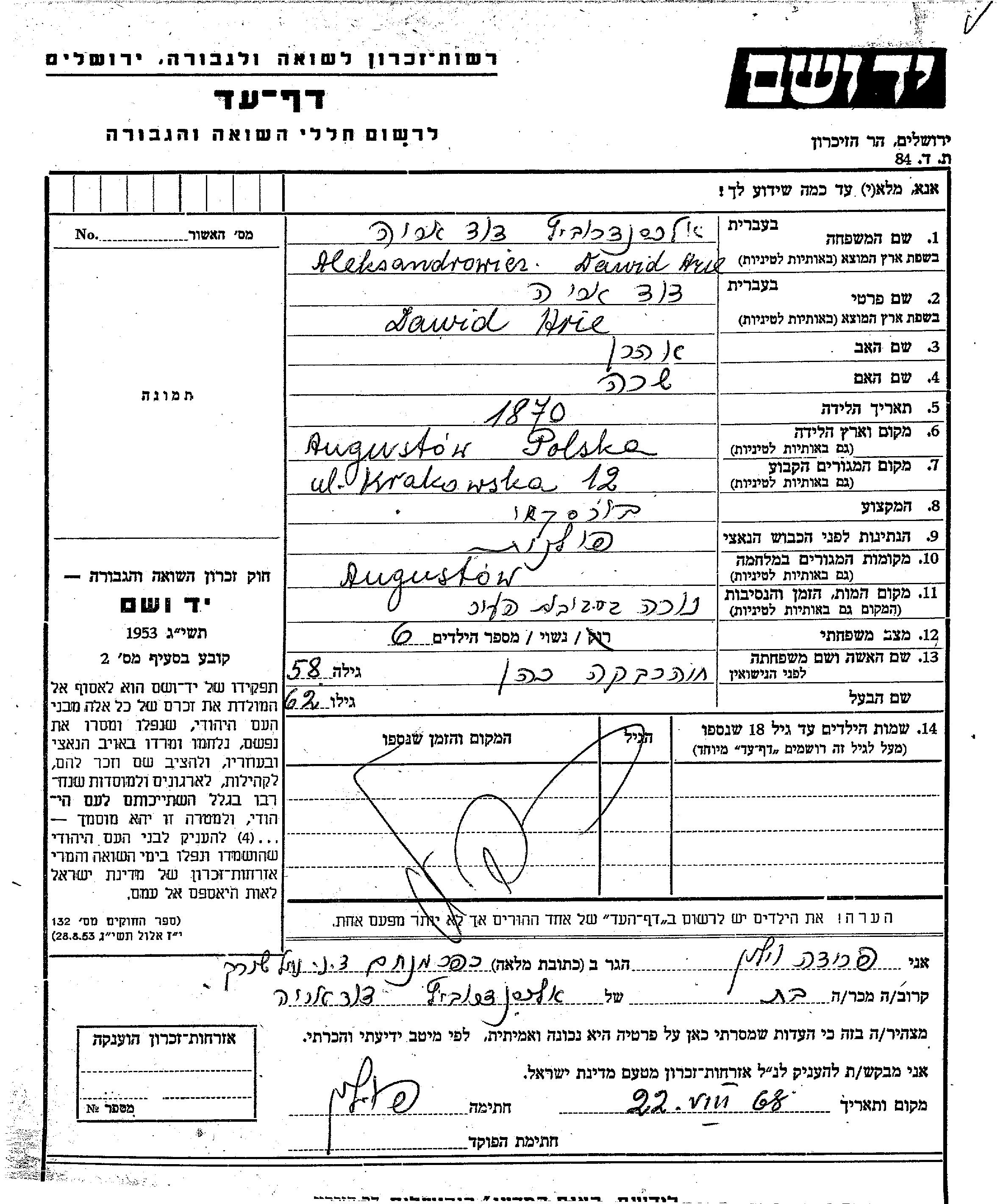 Dawid Arie Aleksandrowicz wurde im Jahr 1870 in Augustów, Polen geboren. Er war der Sohn von Aharon und Sara. Er war Gerber und mit Khava Rivka, geb. Kohen Verheiratet. Vor dem Zweiten Weltkrieg lebte er in Augustów, Polen. Während des Krieges war er in Augustów, Polen.