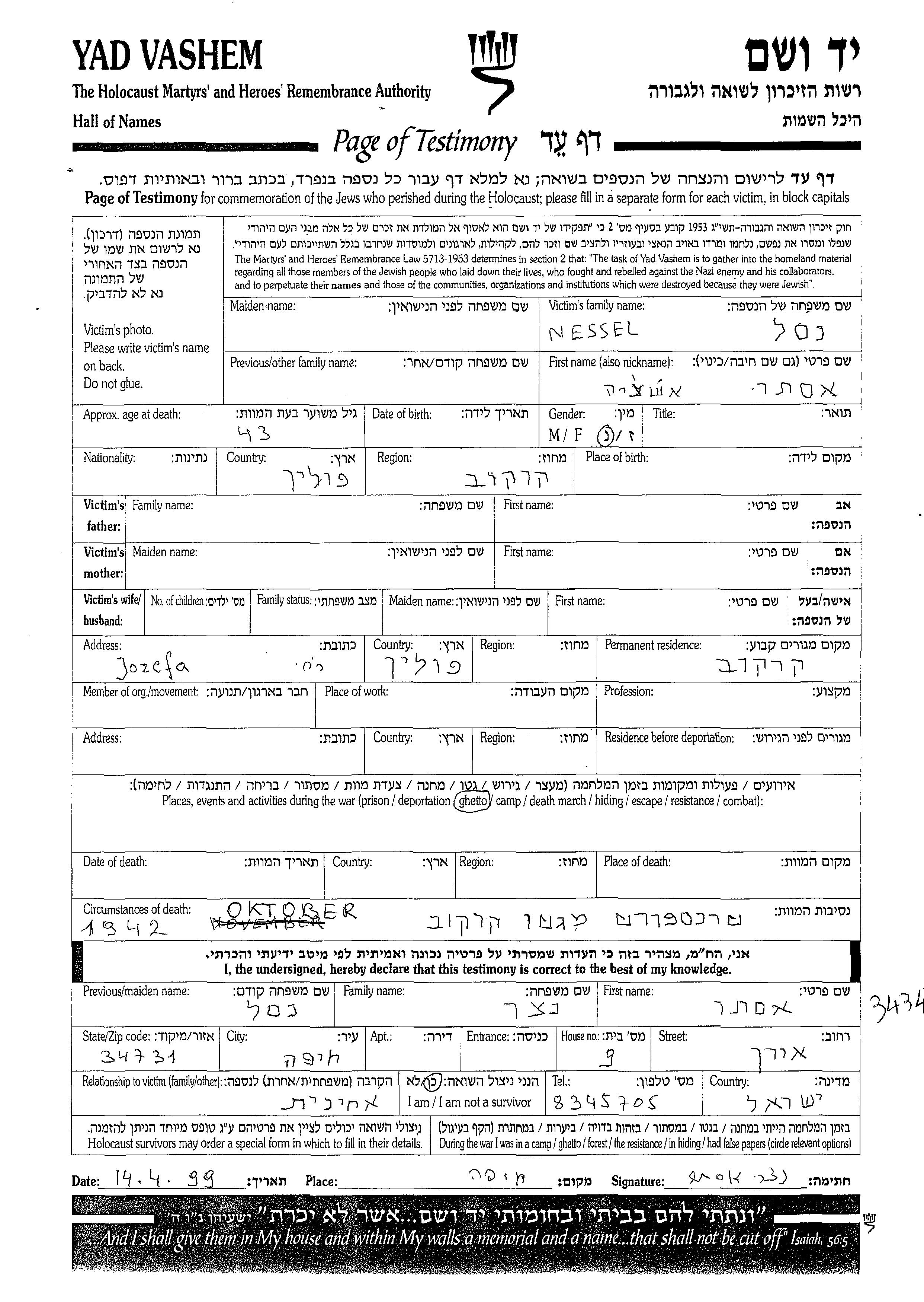 Eshchie Nessel wurde in Krakow, Polen geboren. Vor dem Zweiten Weltkrieg lebte sie in Krakow, Polen. Während des Krieges war sie in Krakow, Polen.