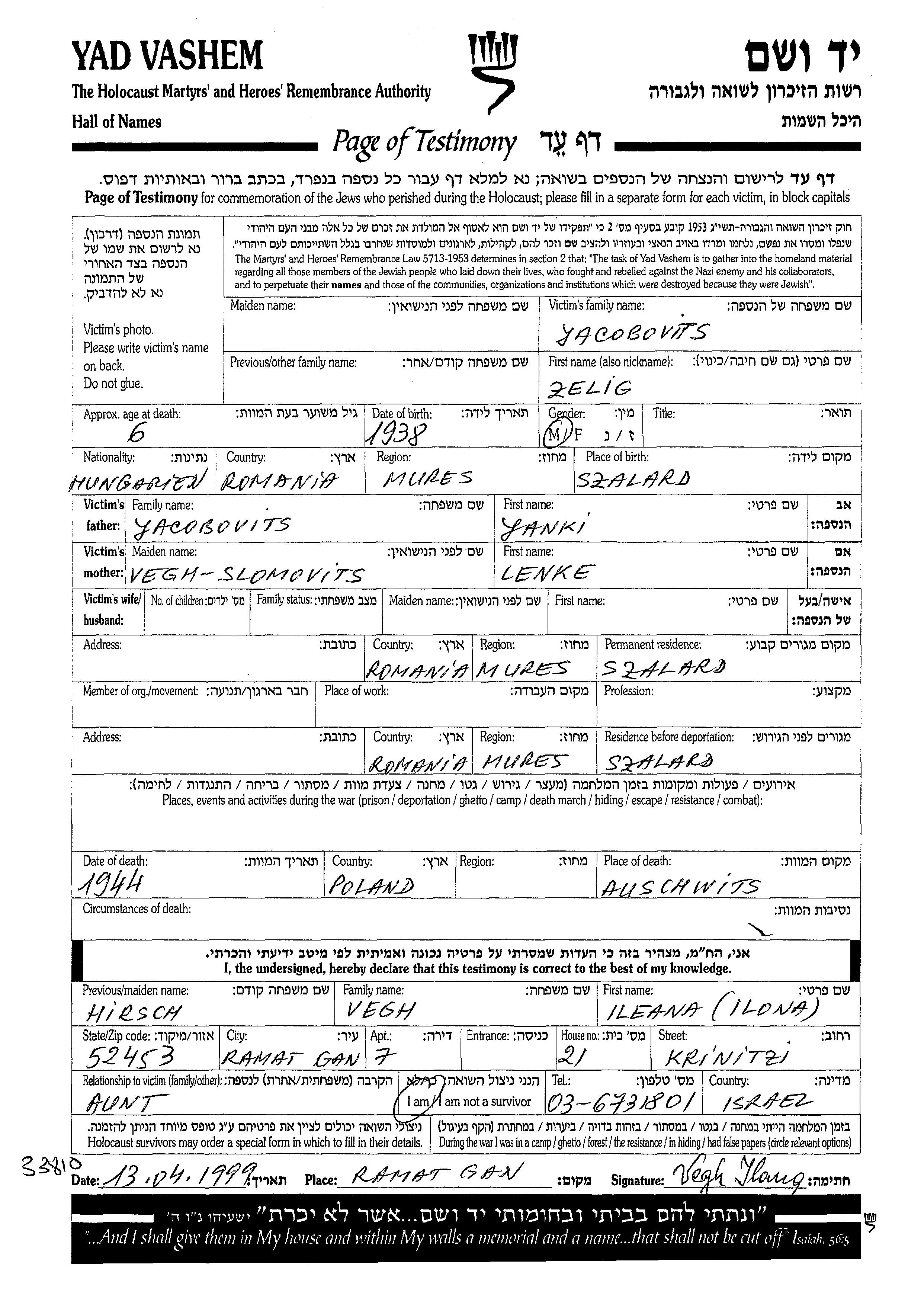Zelig Yacobovits wurde im Jahr 1938 in Szalard, Rumänien geboren. Er war der Sohn von Yanki und Lenke, geb. Slomovits Vegh. Er war Kind. Vor dem Zweiten Weltkrieg lebte er in Szalard, Rumänien. Während des Krieges war er in Szalard, Rumänien.