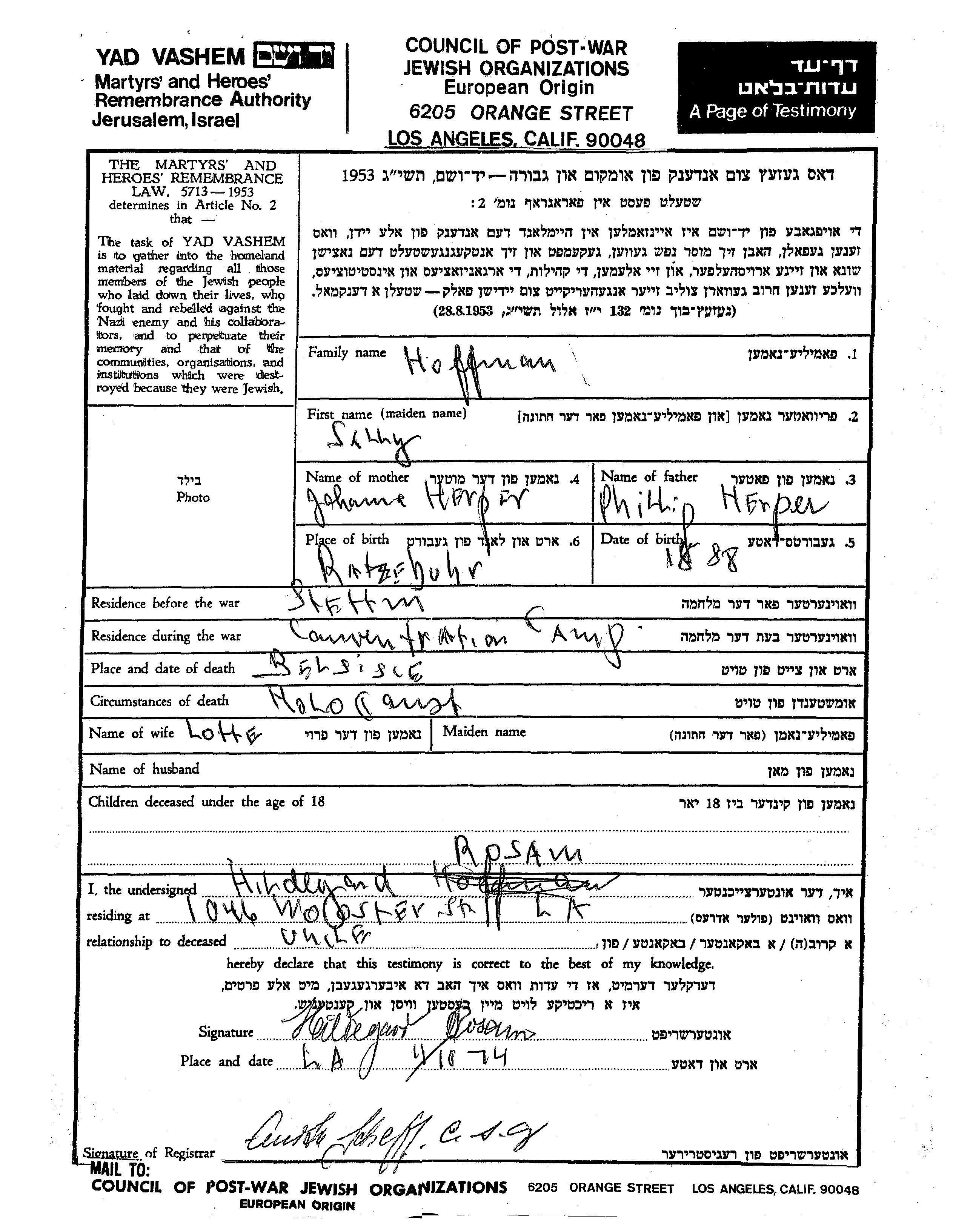 Sally Hoffman wurde im Jahr 1888 in Ratzebuhr, Deutsches Reich geboren. Er war der Sohn von Phillip und Johanna, geb. Herper. Er war mit Lotte Verheiratet. Vor dem Zweiten Weltkrieg lebte er in Stettin, Deutsches Reich.