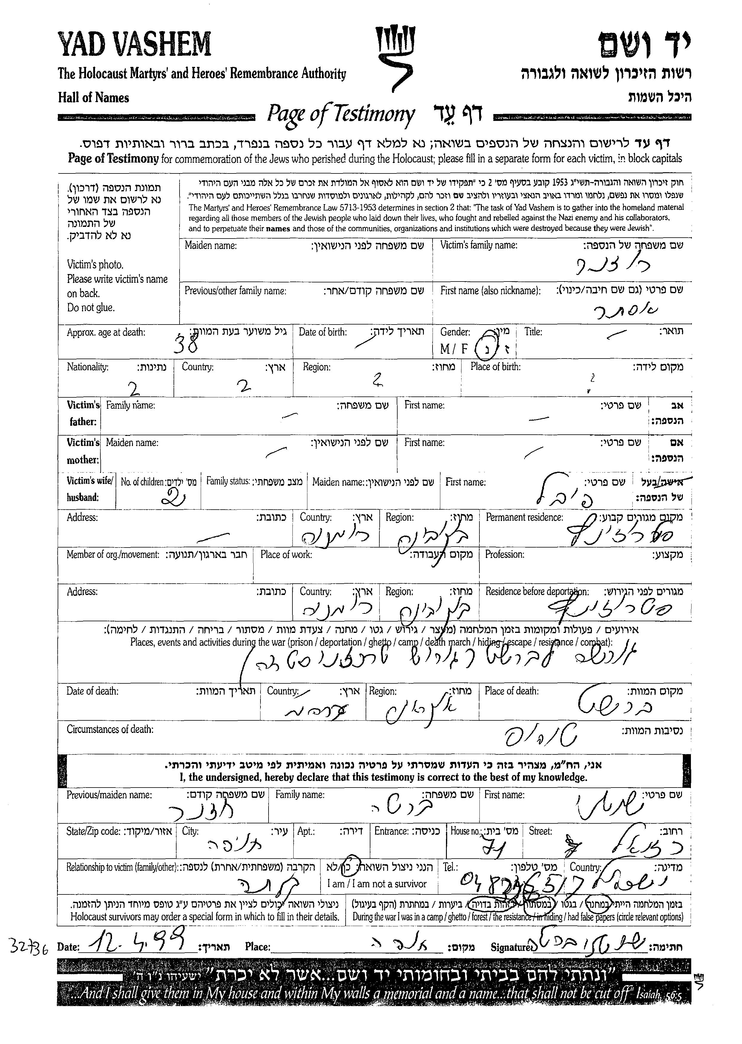 Ester Rozner. Sie war mit Feibel Verheiratet. Vor dem Zweiten Weltkrieg lebte sie in Storojinet, Rumänien. Während des Krieges war sie in Storojinet, Rumänien.